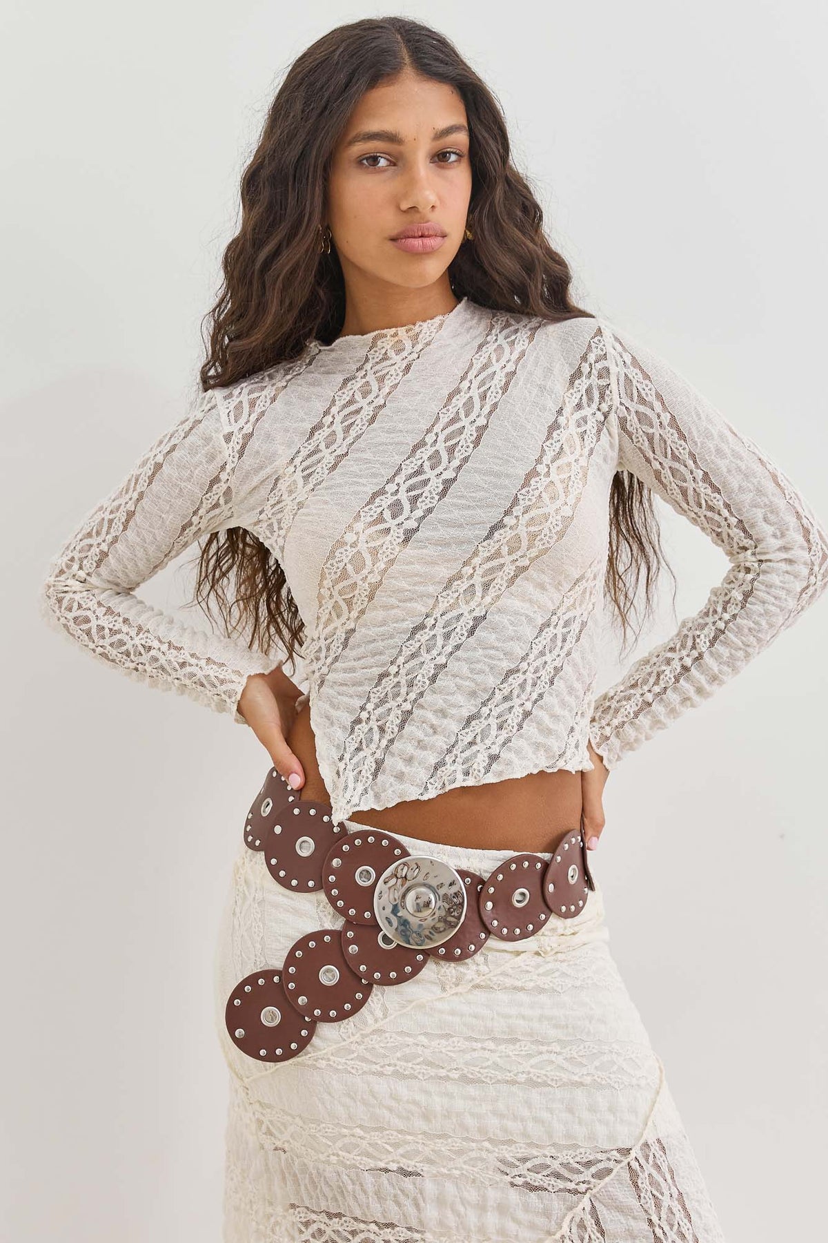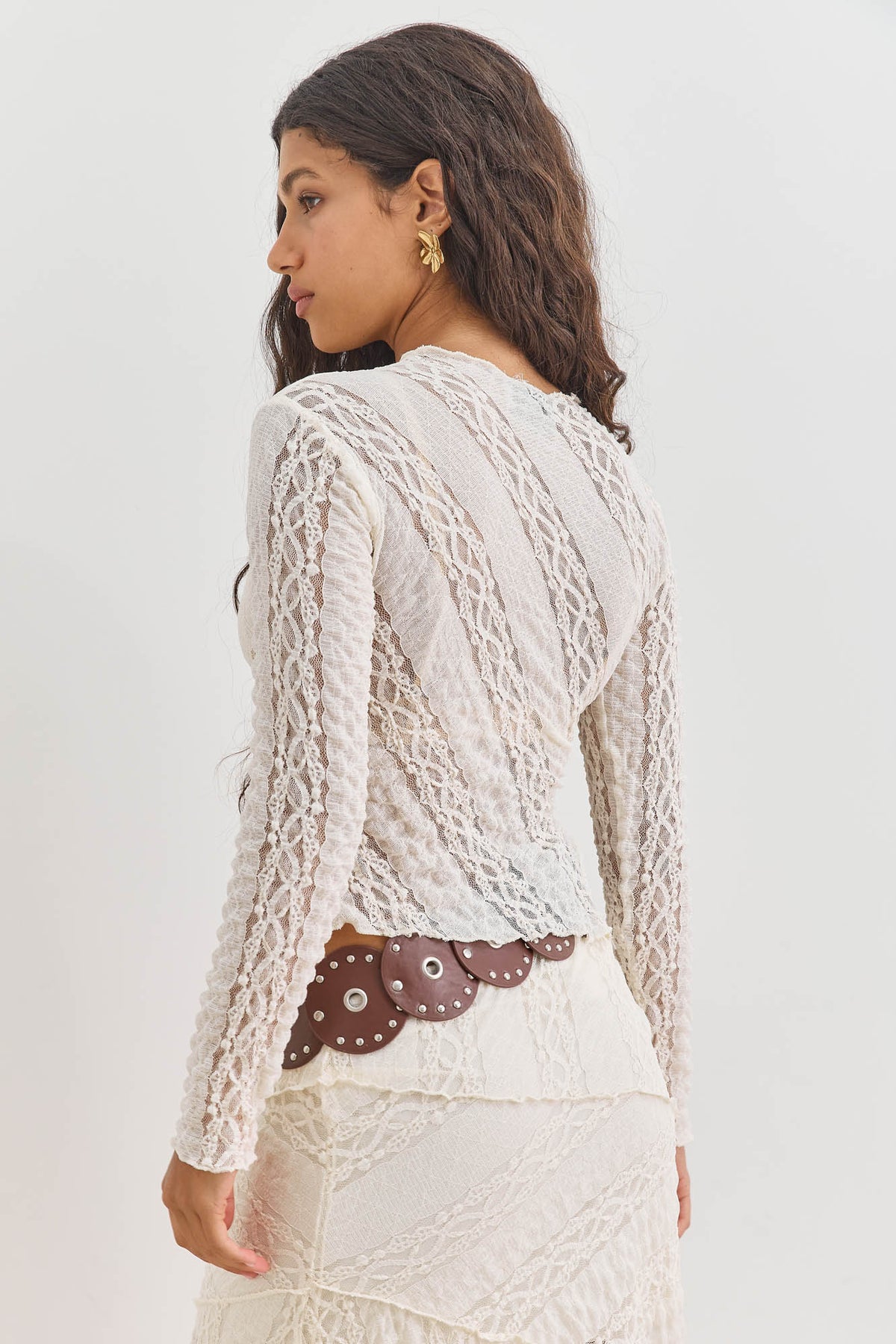 חולצה שקפקפה עם טקסטורת פסים אלכסוניים מבד תחרה ושסע צידי