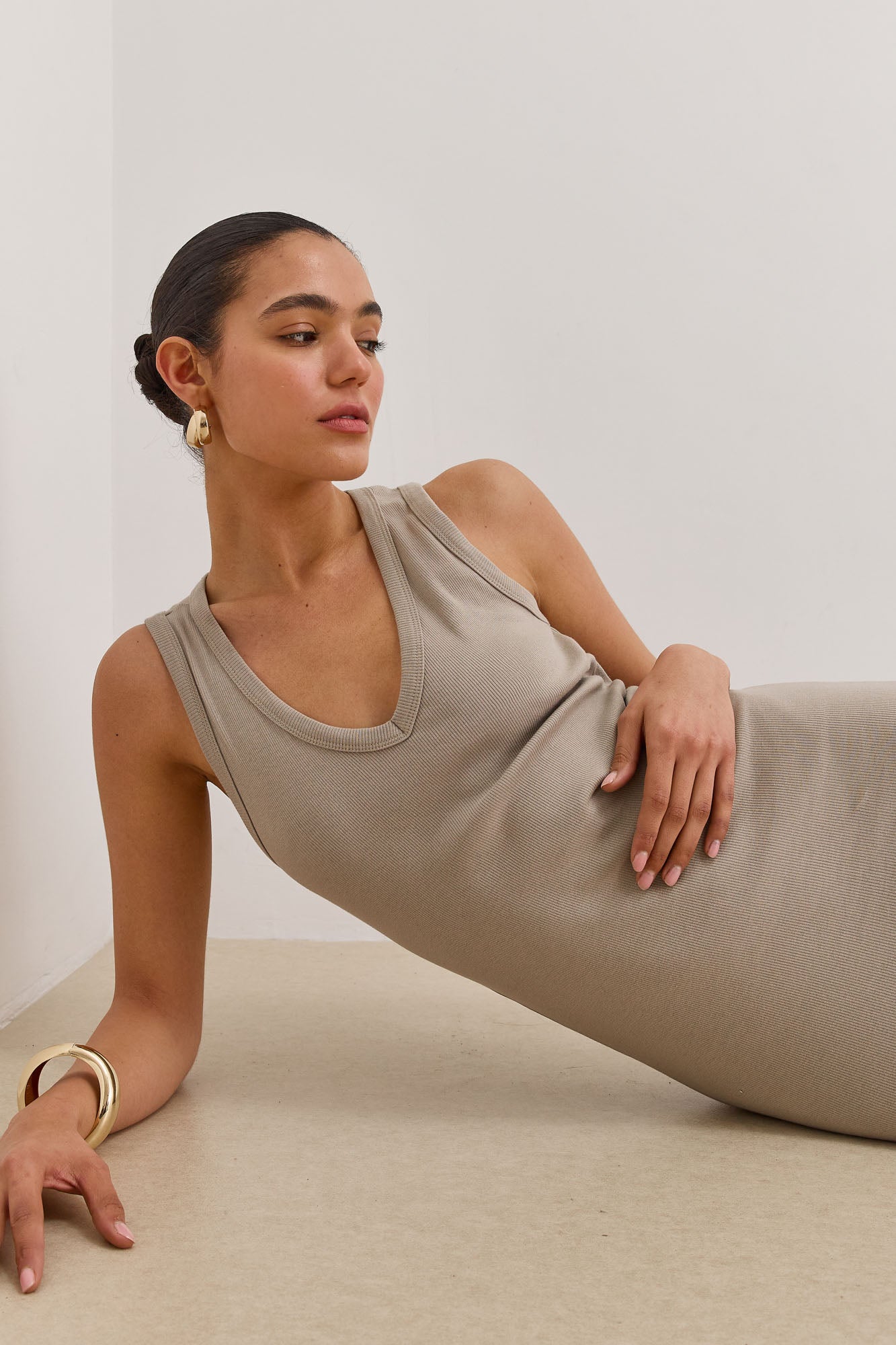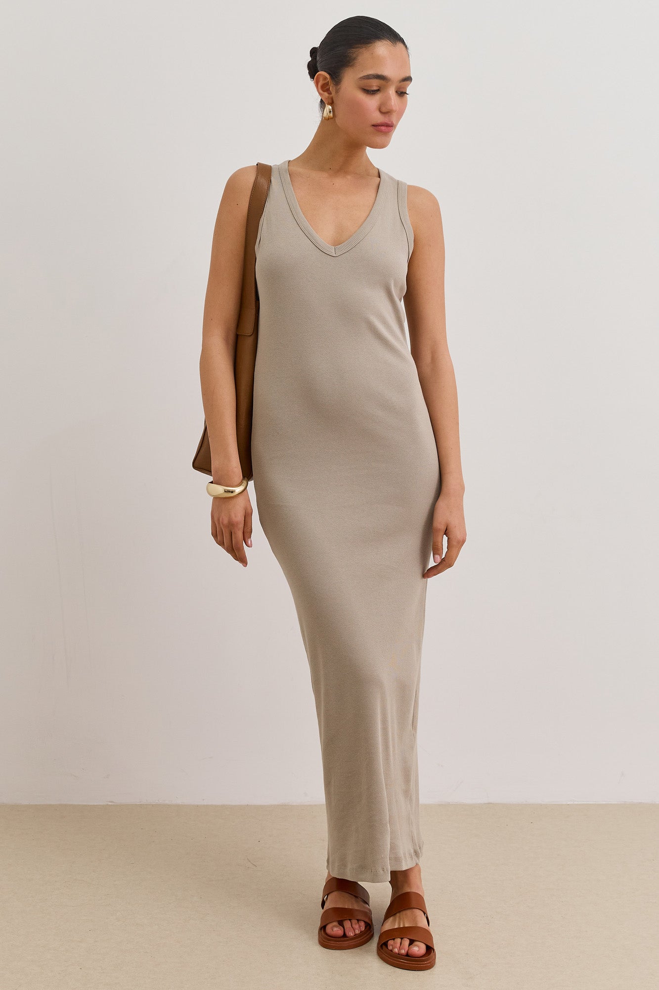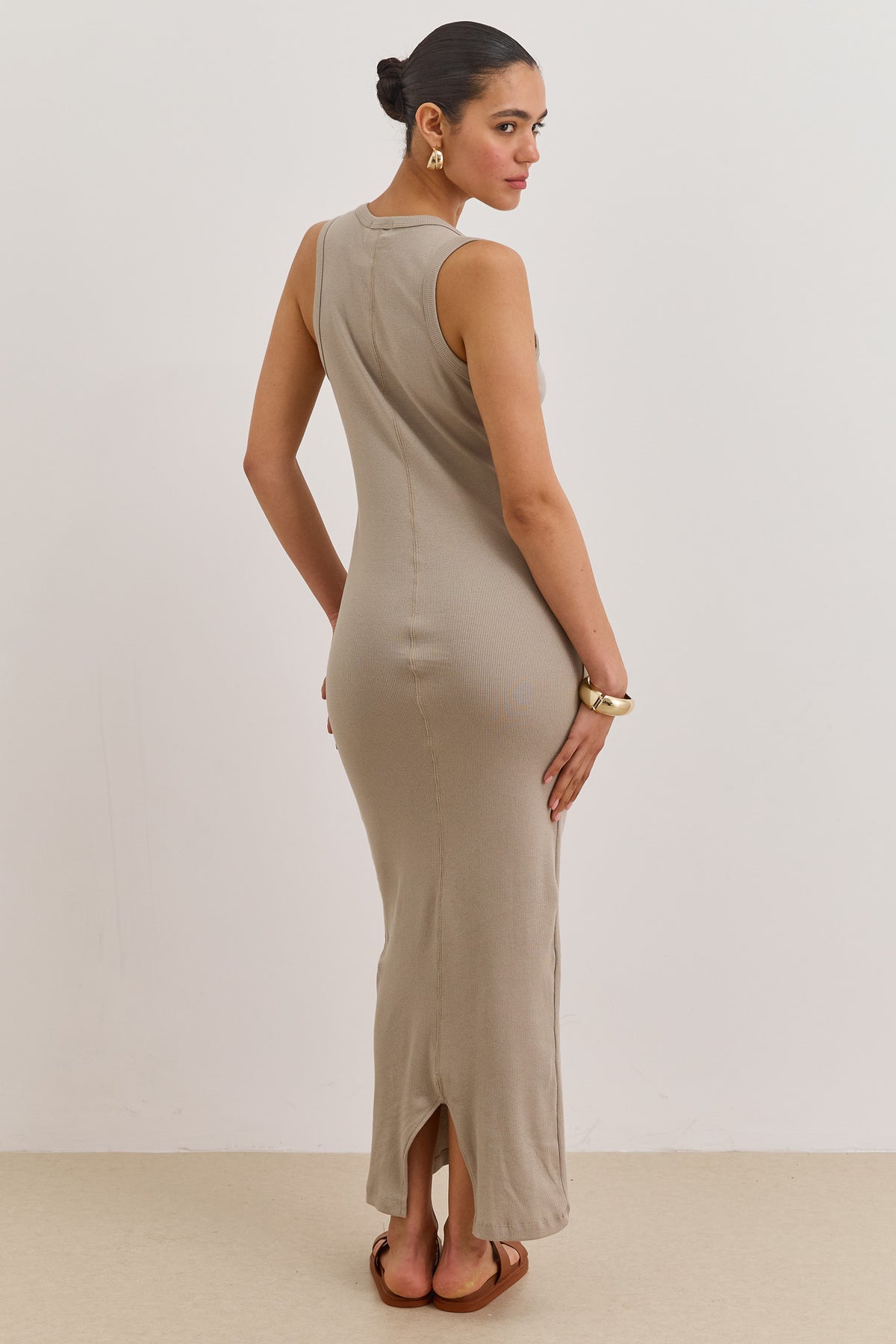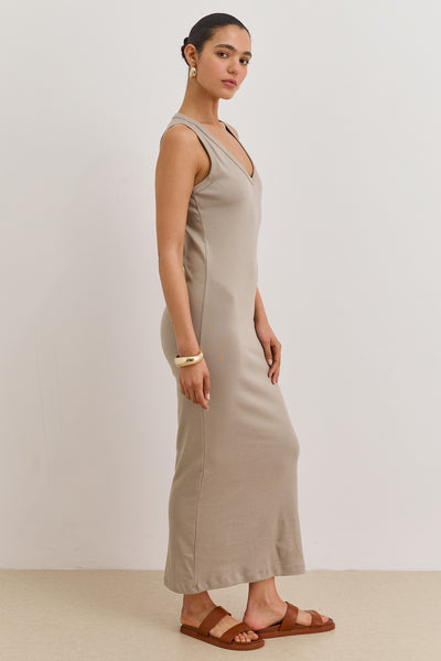 שמלת מקסי מבד ריב בגזרה צמודה עם מחשוף וי ושסע אחורי