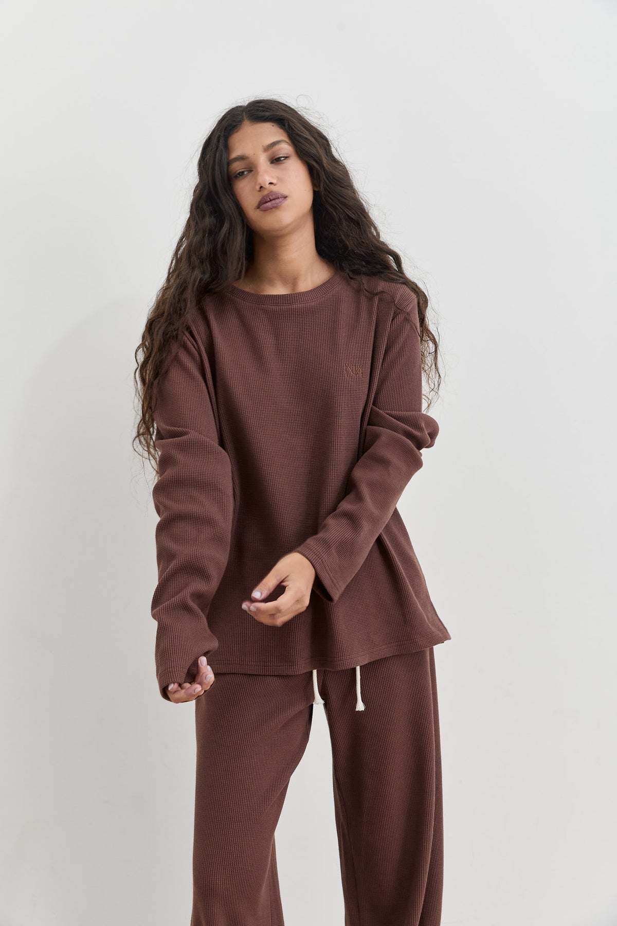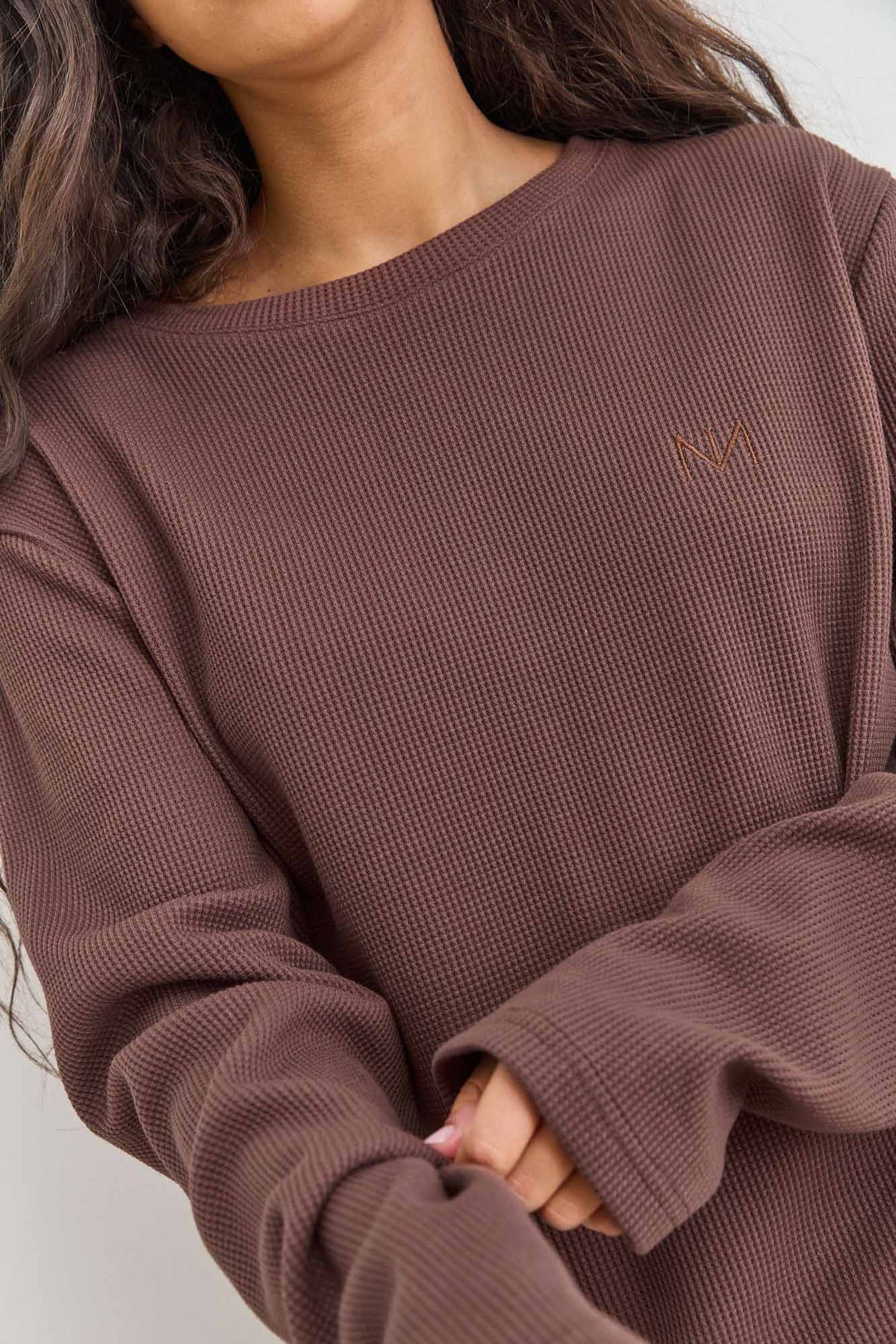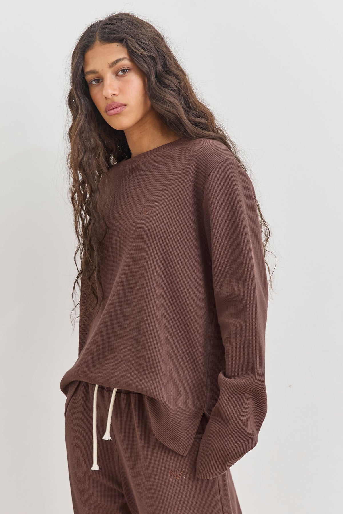 חולצת טי אוברסייז עם שרוולים ארוכים ורקמת לוגו מבד וופל מפנק