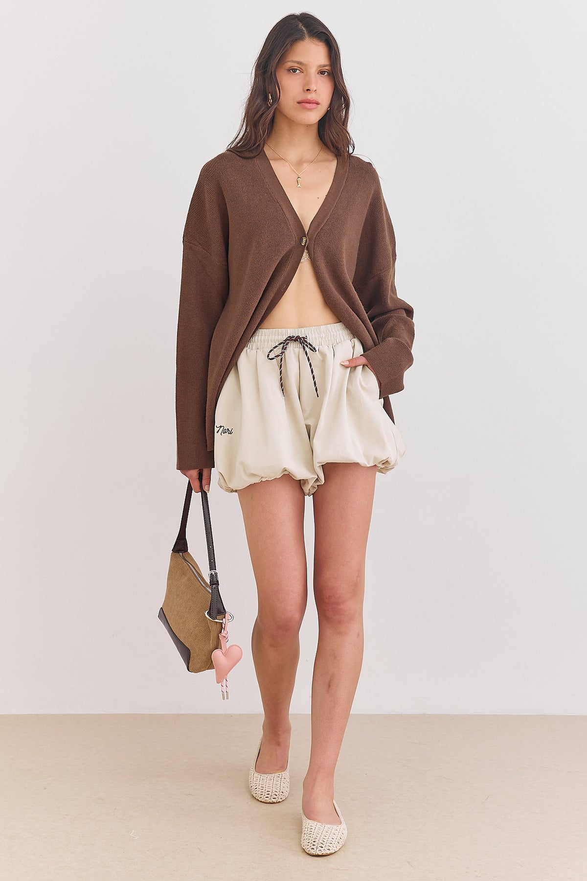 מכנסיים קצרים בגזרת בלון בשילוב גומי במותן, שרוך ולוגו נורי
