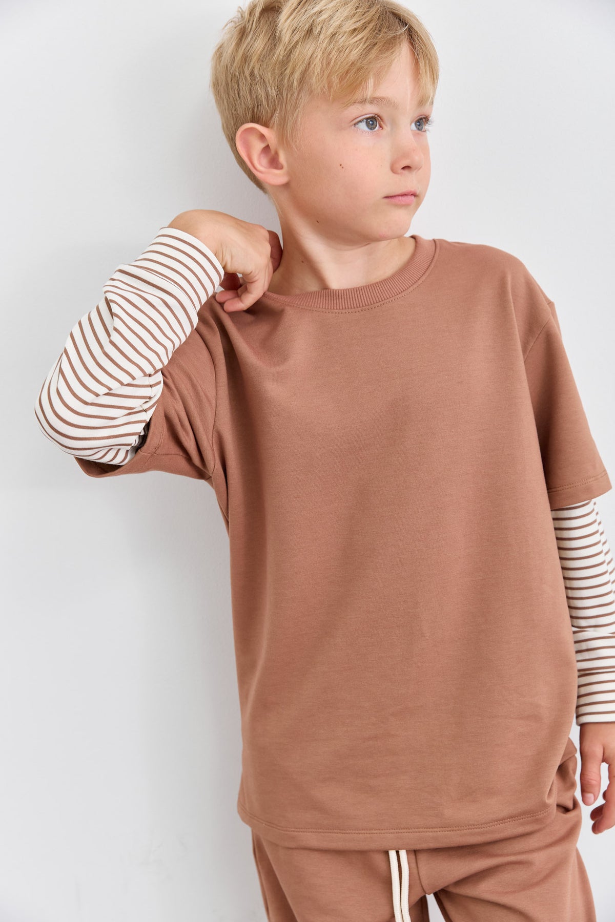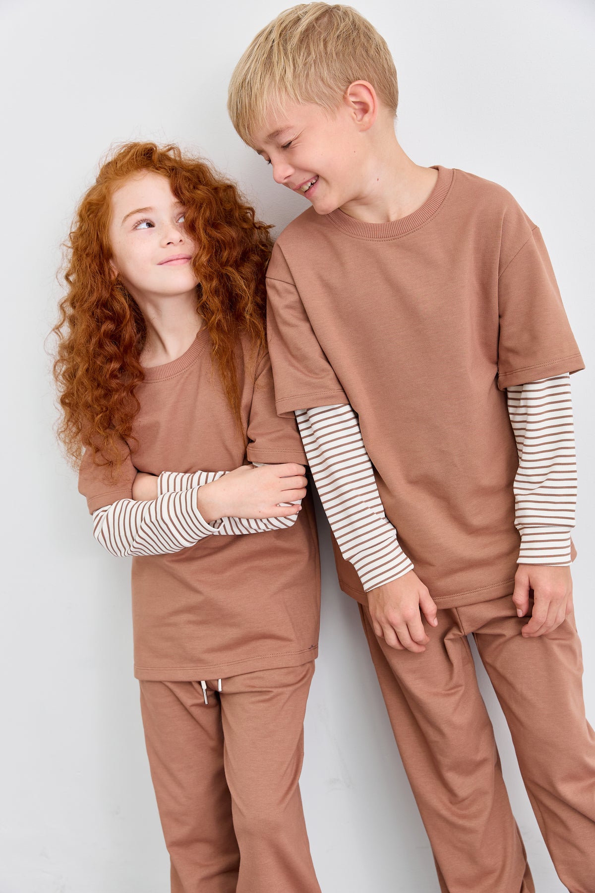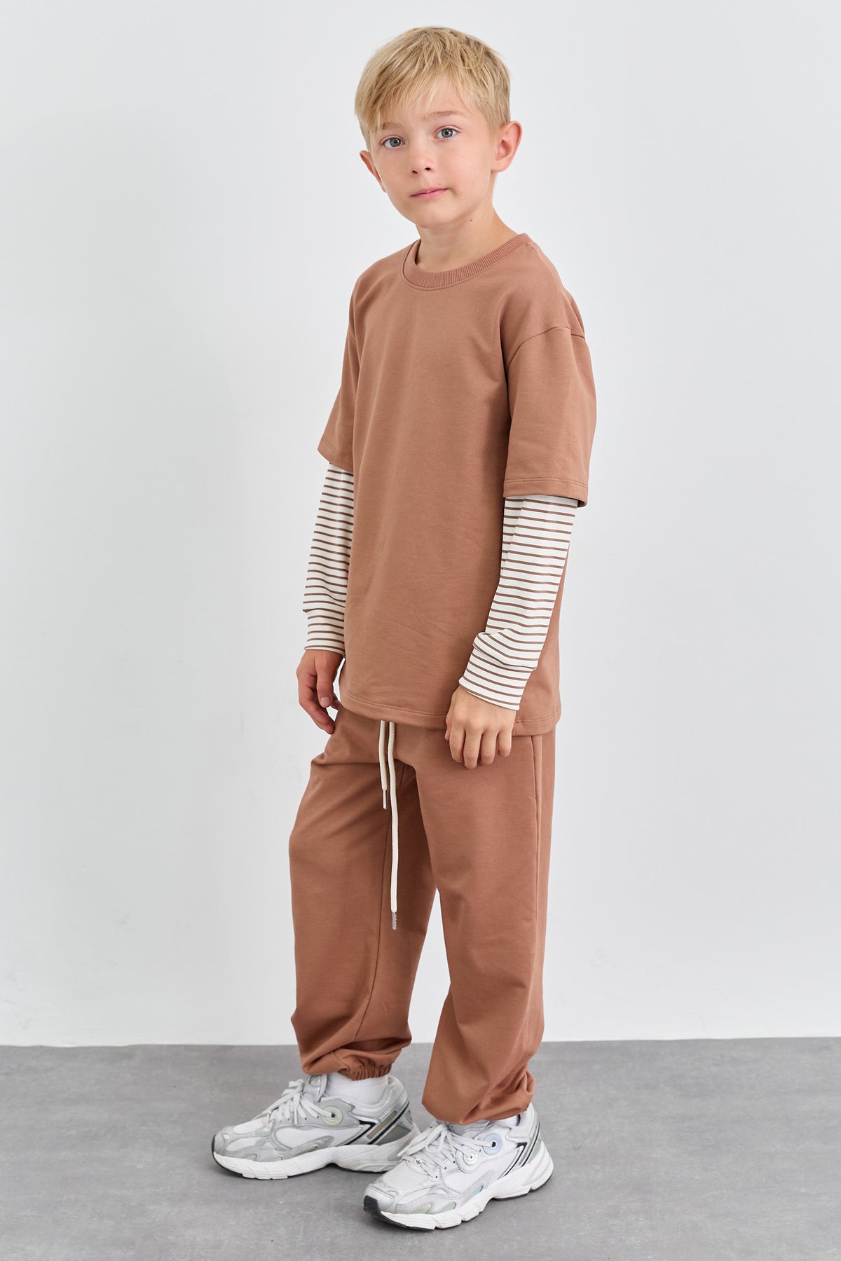 חליפת שני חלקים יוניסקס טי שירט אוברסייז עם שילוב שרוולים מבד כותנה פסים ומכנס בלון עם גומי במותן ושרוך