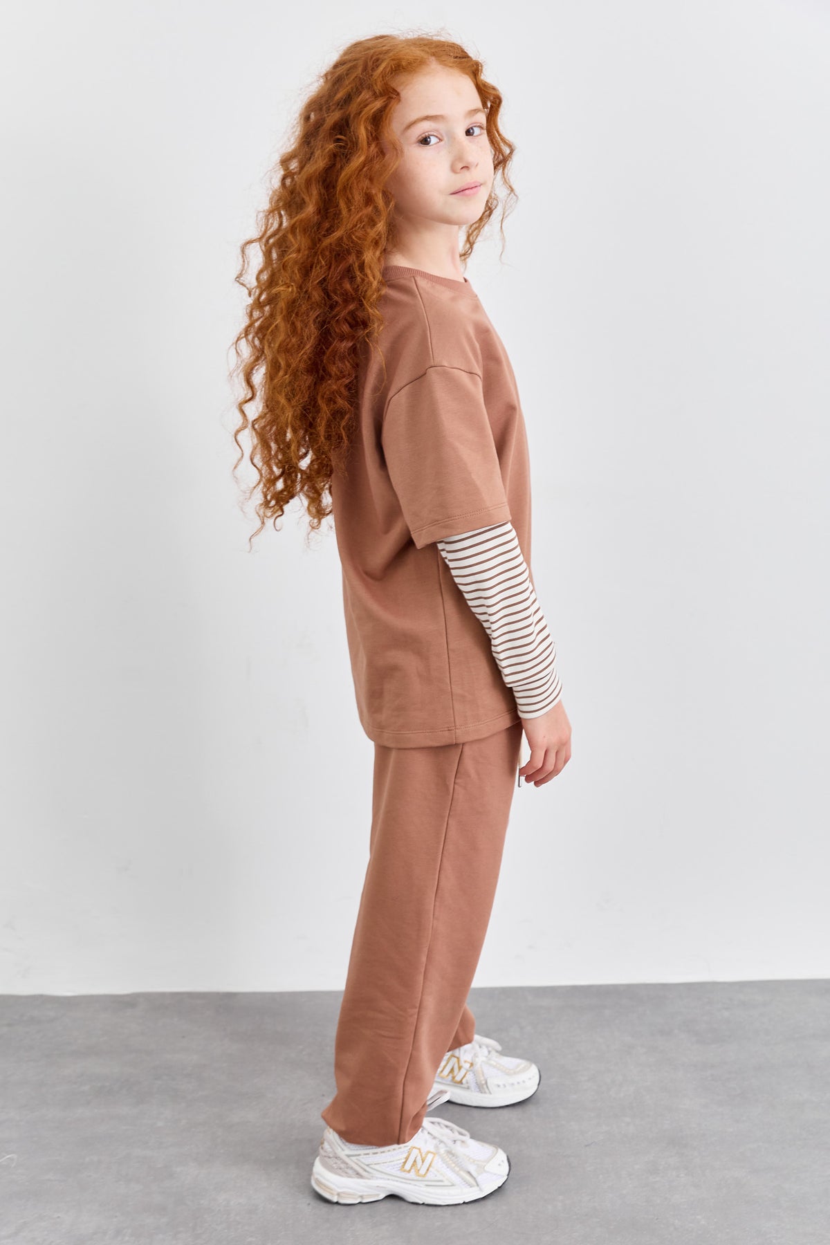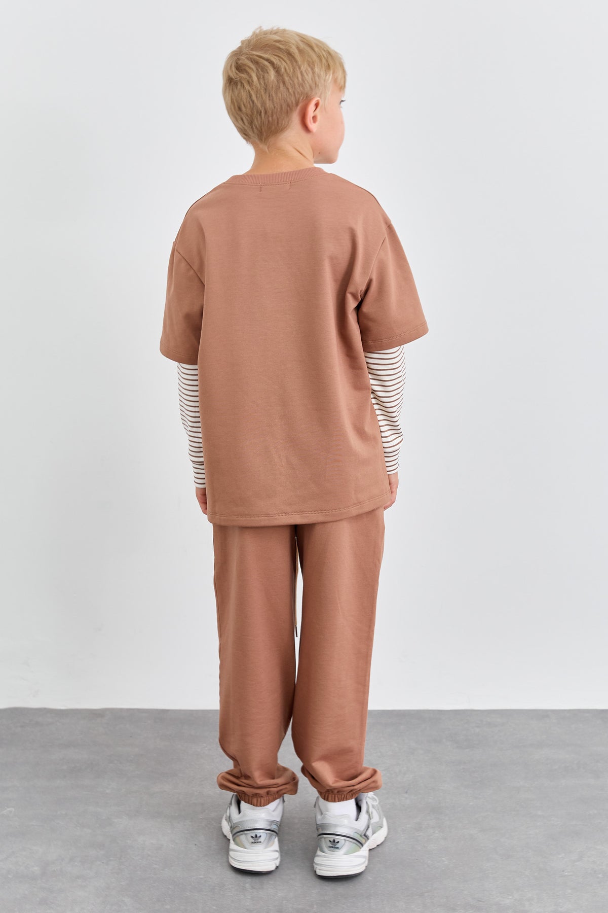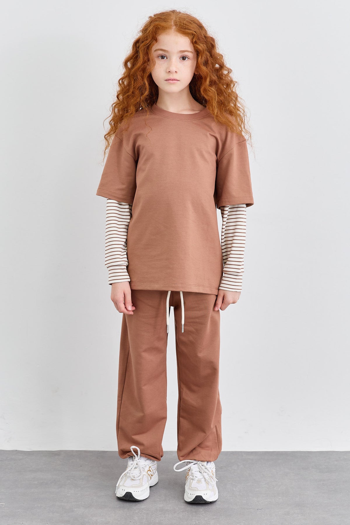 חליפת שני חלקים טי שירט שרוול ארוך בד משולב ומכנסי בלון | בז'