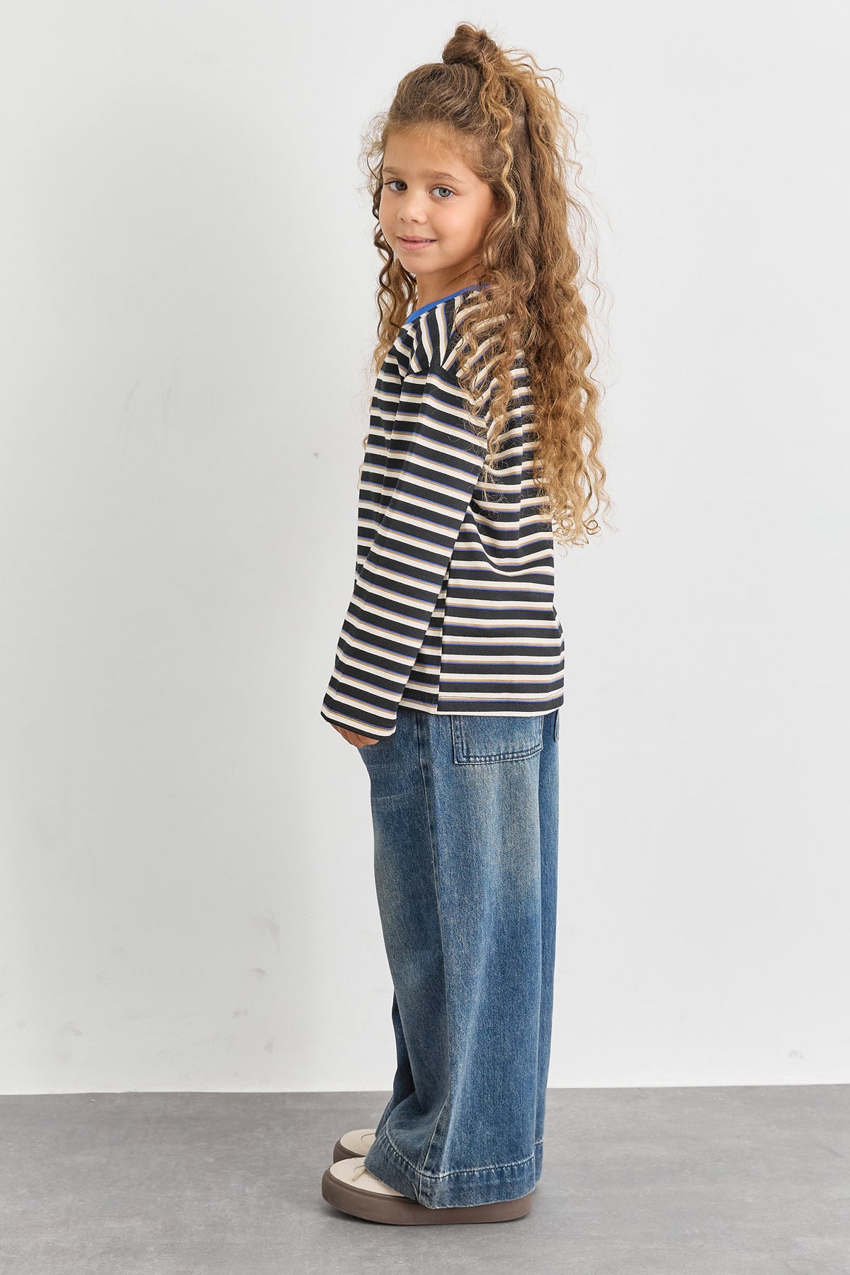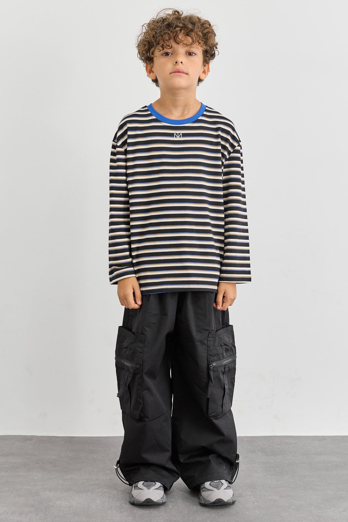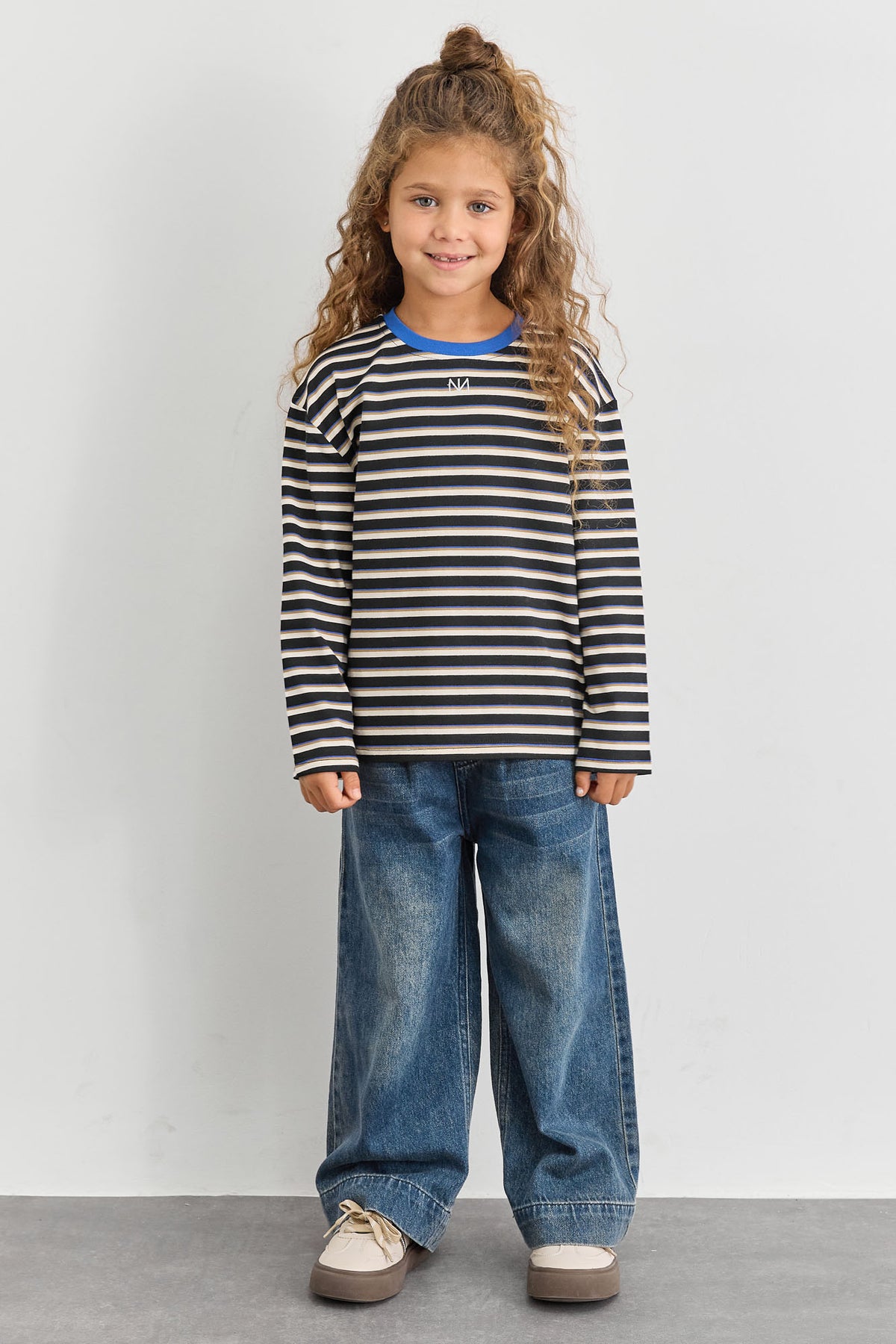 טי שירט בגזרת אוברסייז עם שרוול ארוך מבד פסים צווארון בשילוב צבע עם רקמת לוגו