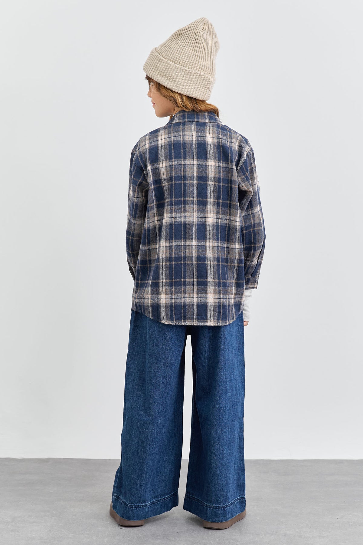 חולצה מכופתרת בגזרת אוברסייז מבד פליז נעים, עם הדפס משבצות כיף בחזה עם רקמת לוגו