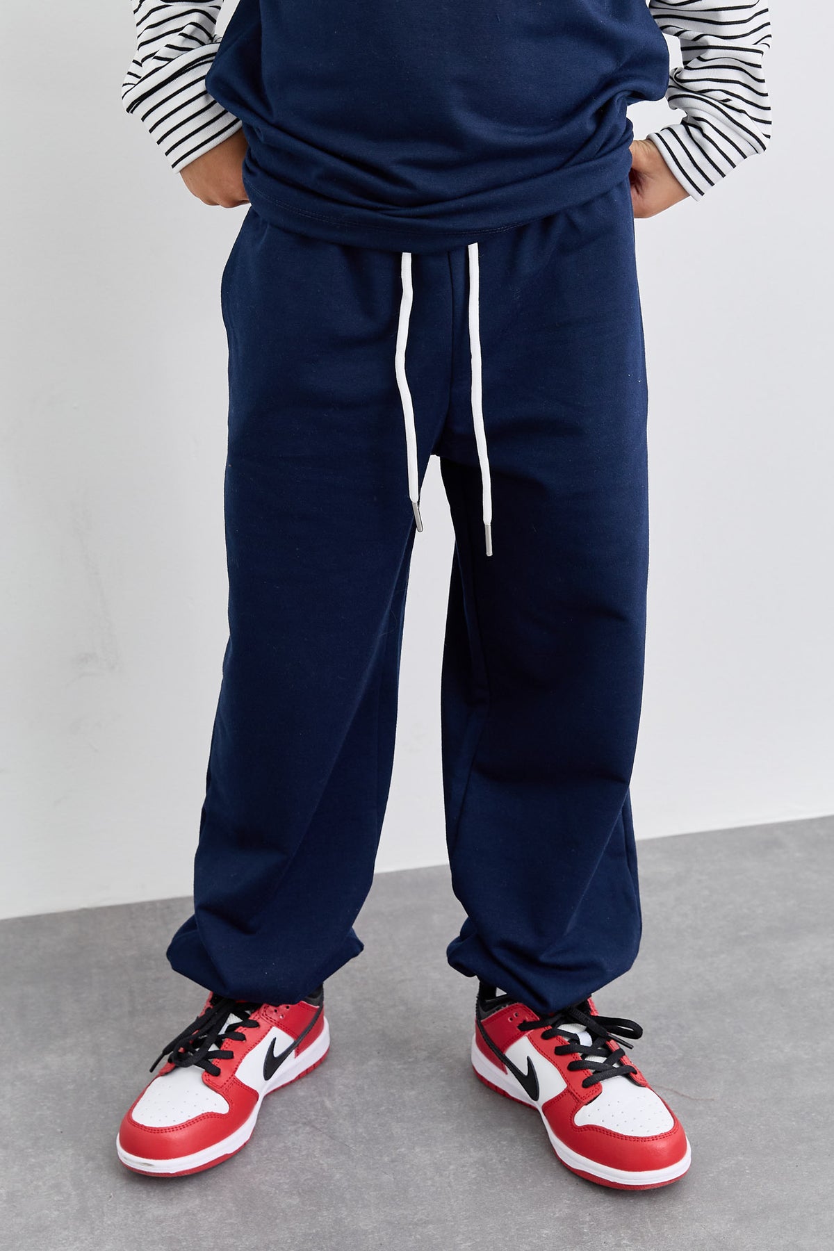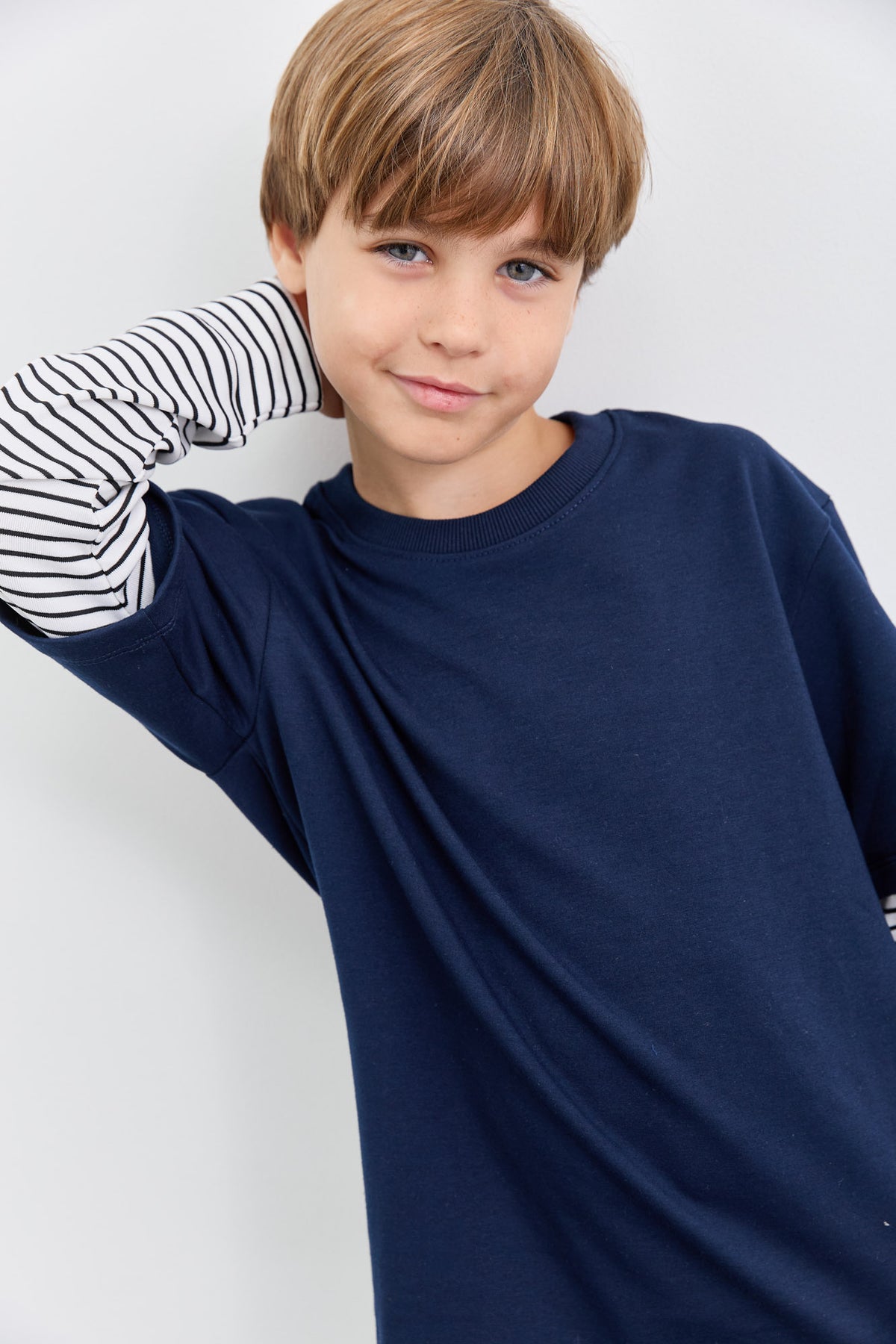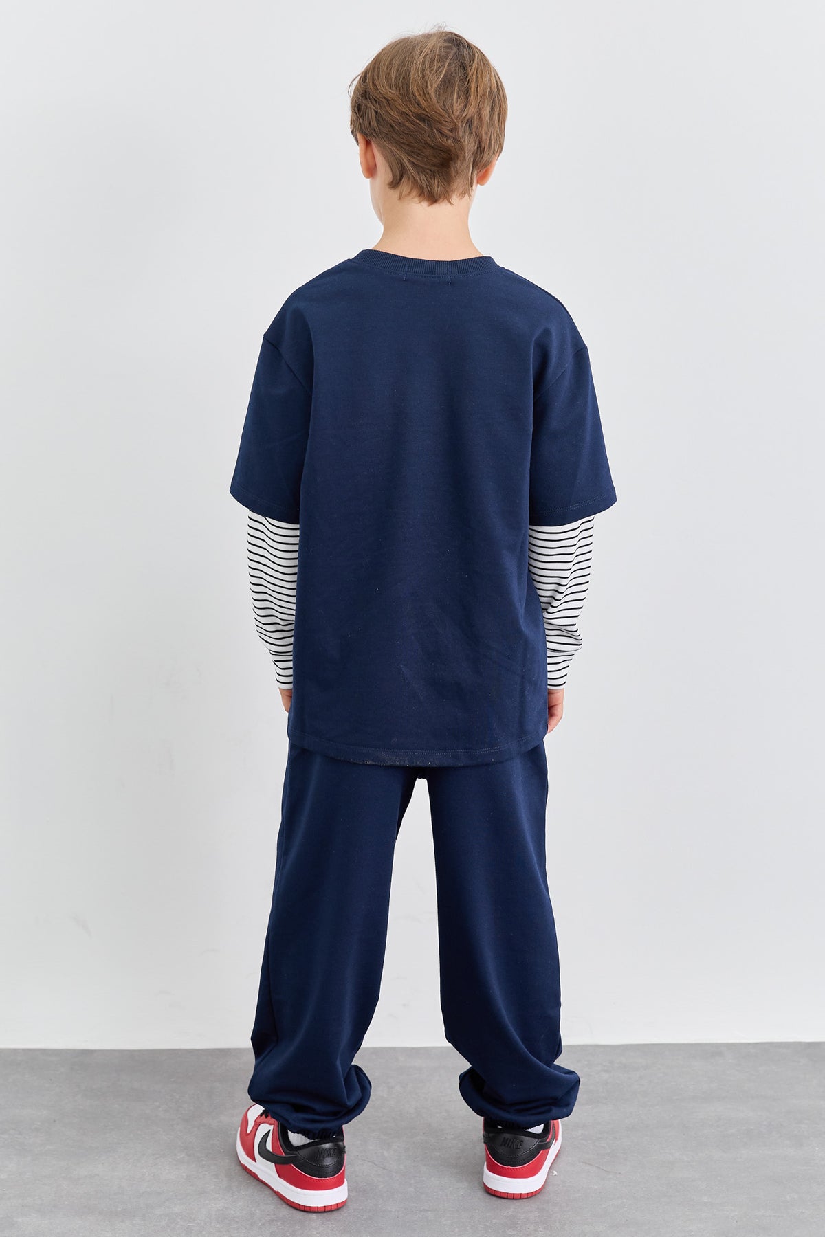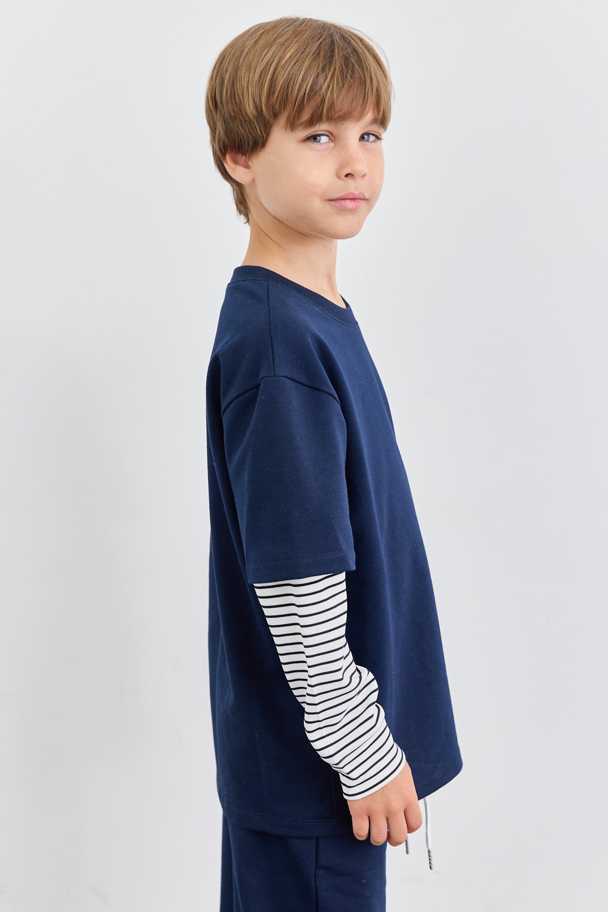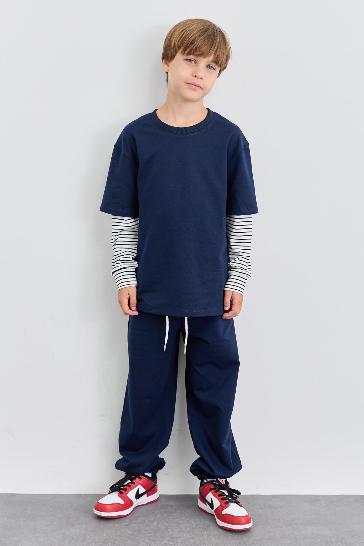 חליפת שני חלקים טי שירט אוברסייז עם שילוב שרוולים מבד כותנה פסים ומכנס בלון עם גומי במותן ושרוך