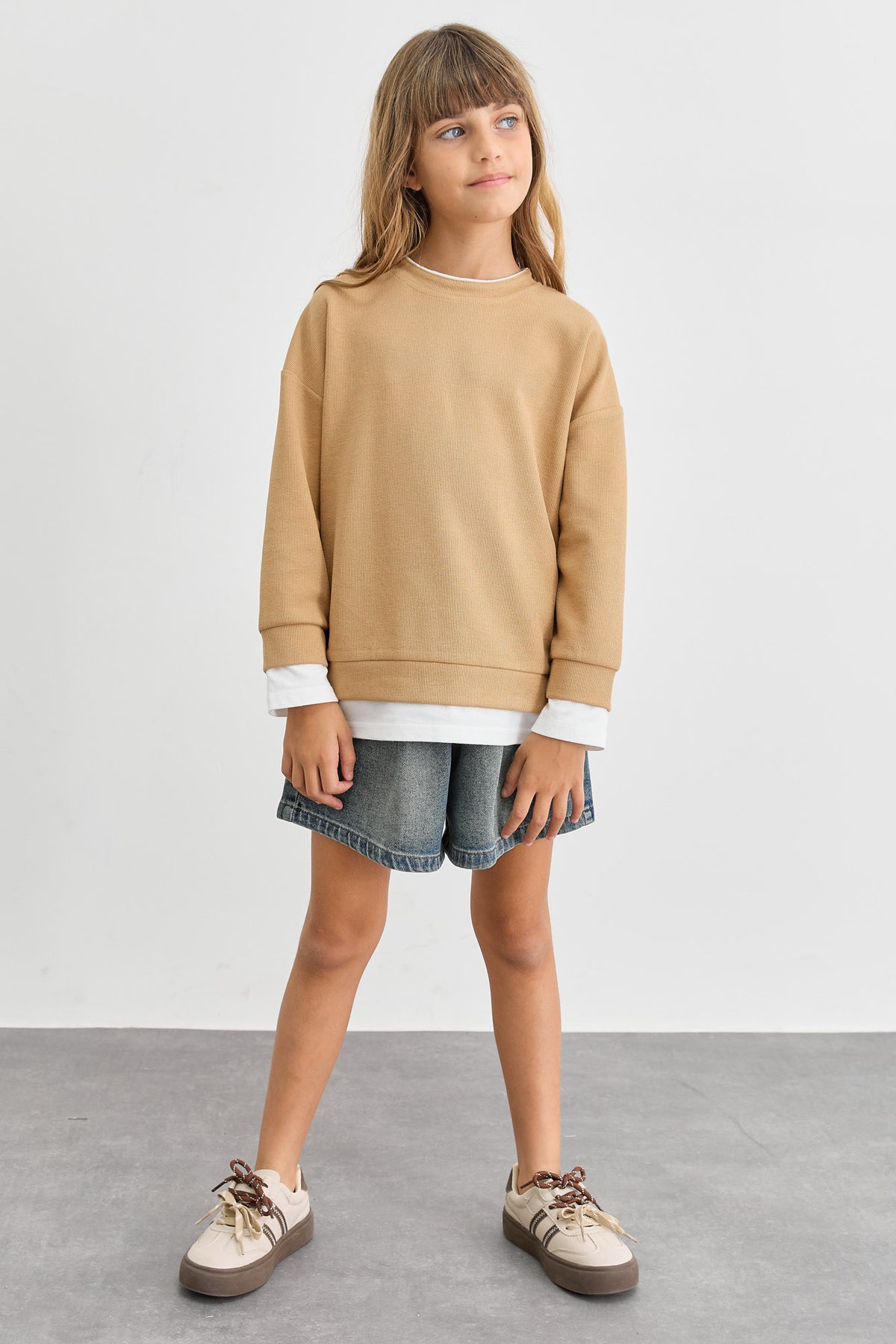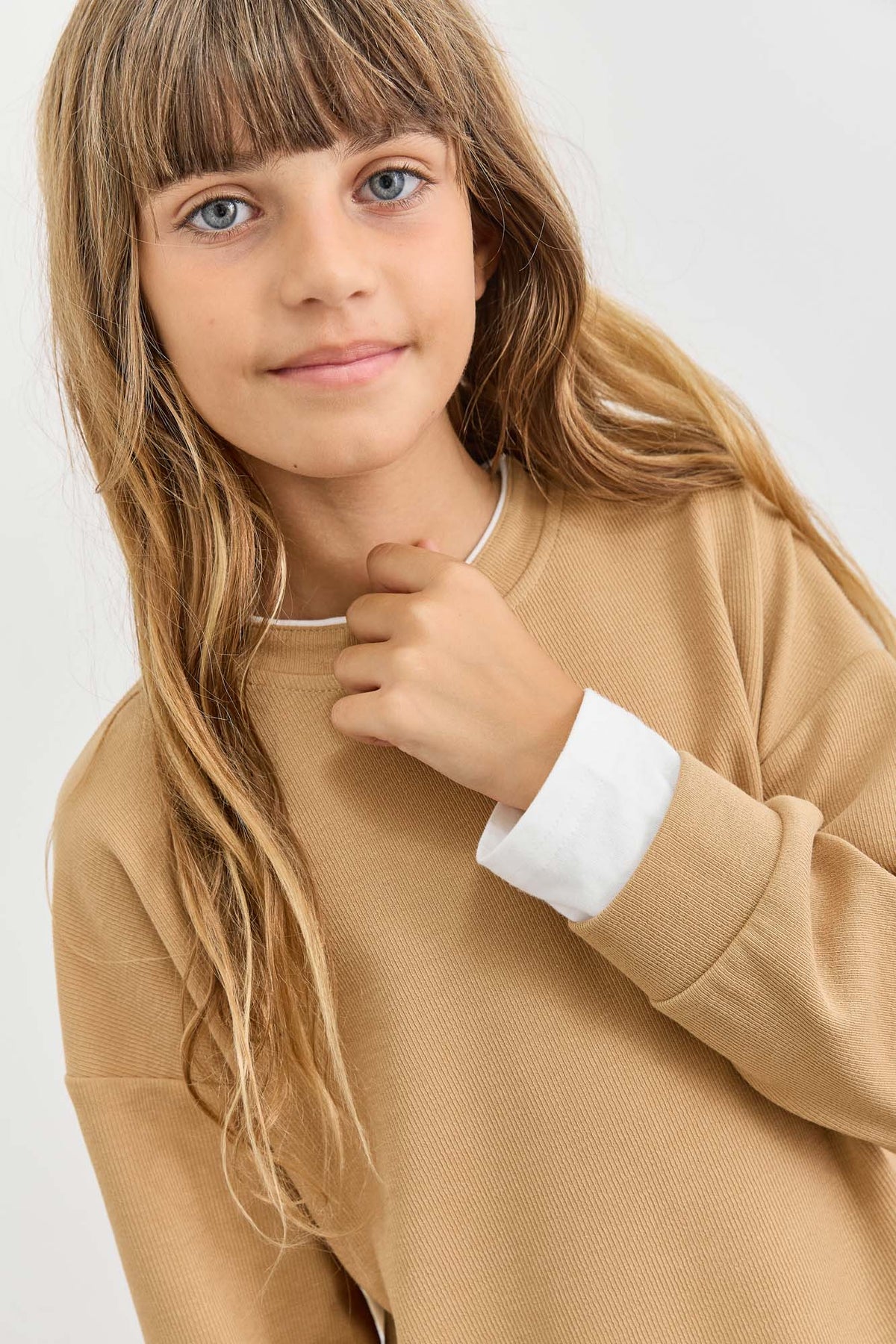 חולצת פוטר בגזרה אוברסייזית, עם שרוולים ארוכים, צווארון עגול, ודיטייל בד משולב