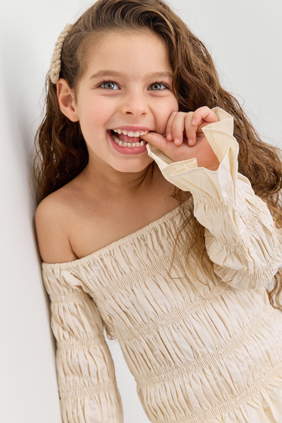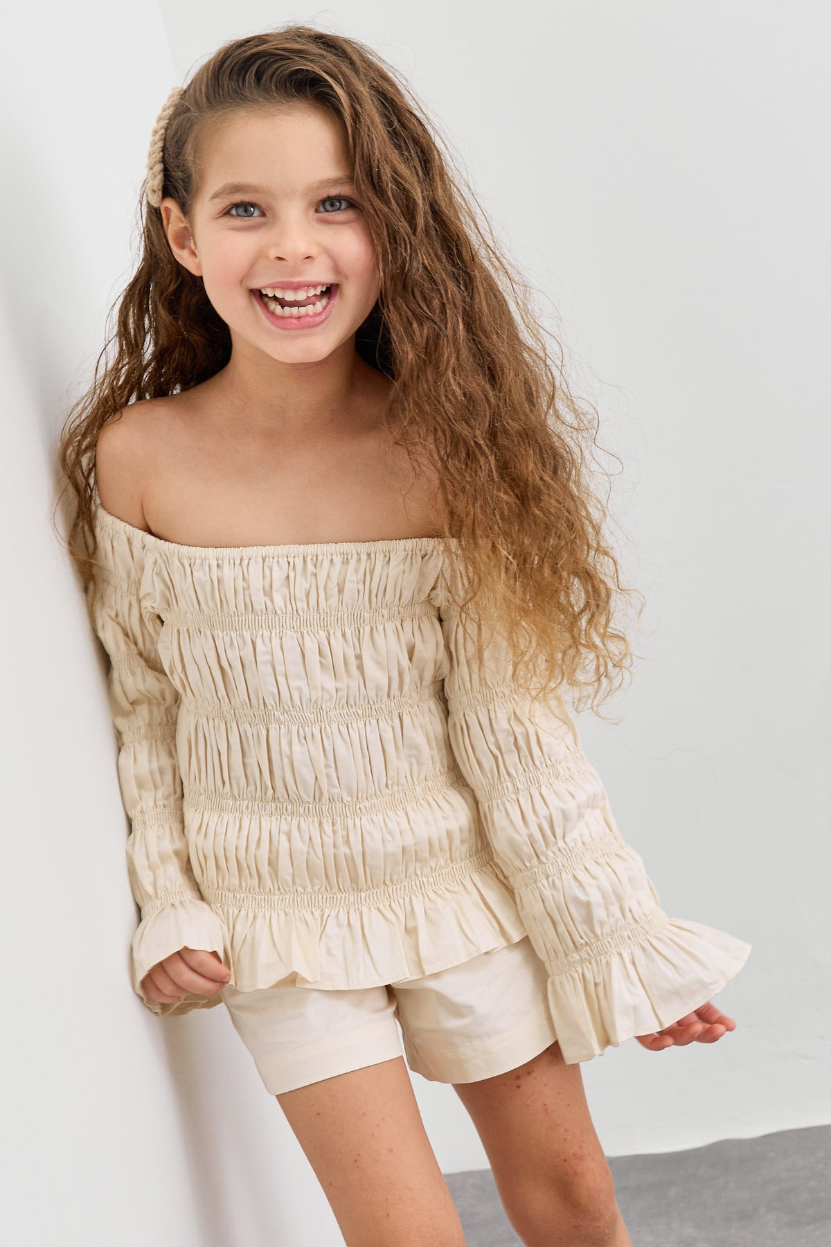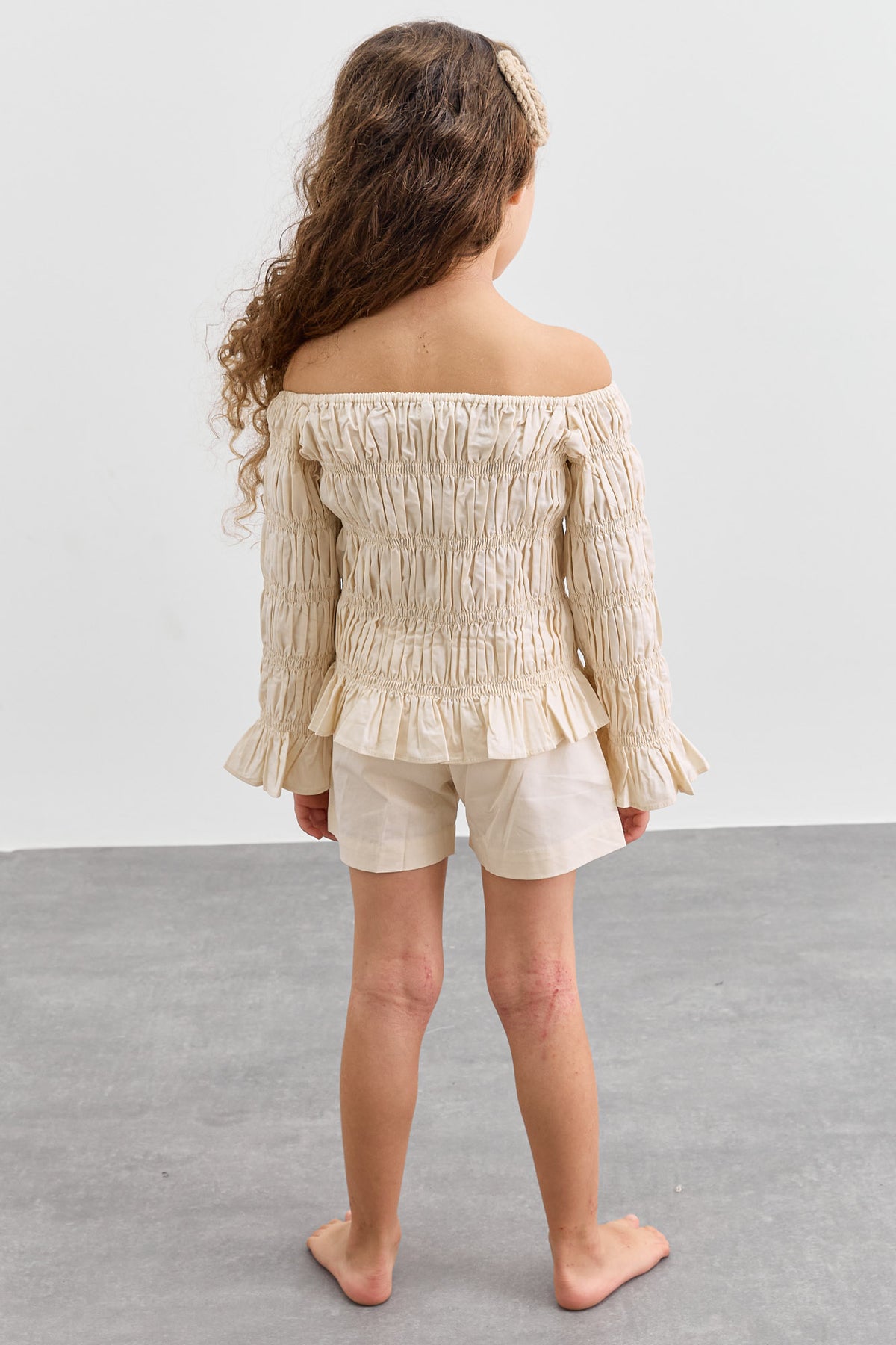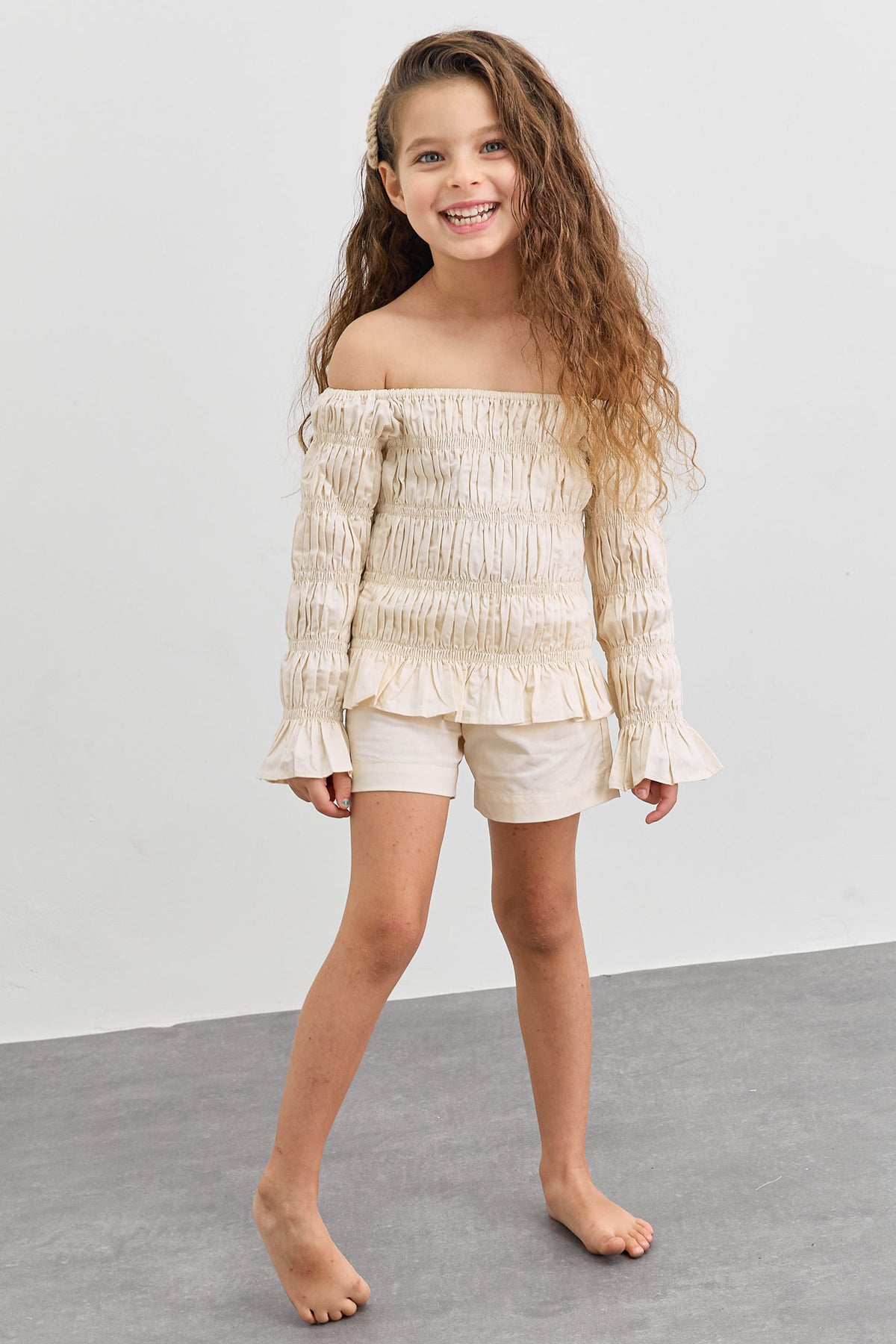 חליפה הנמכרת כסט וכוללת חולצת כיווצים בגזרת אוף שולדרס עם שרוולים בסיומת מתרחבת ומכנסיים קצרים תואמים עם גומי במותן וכיסים