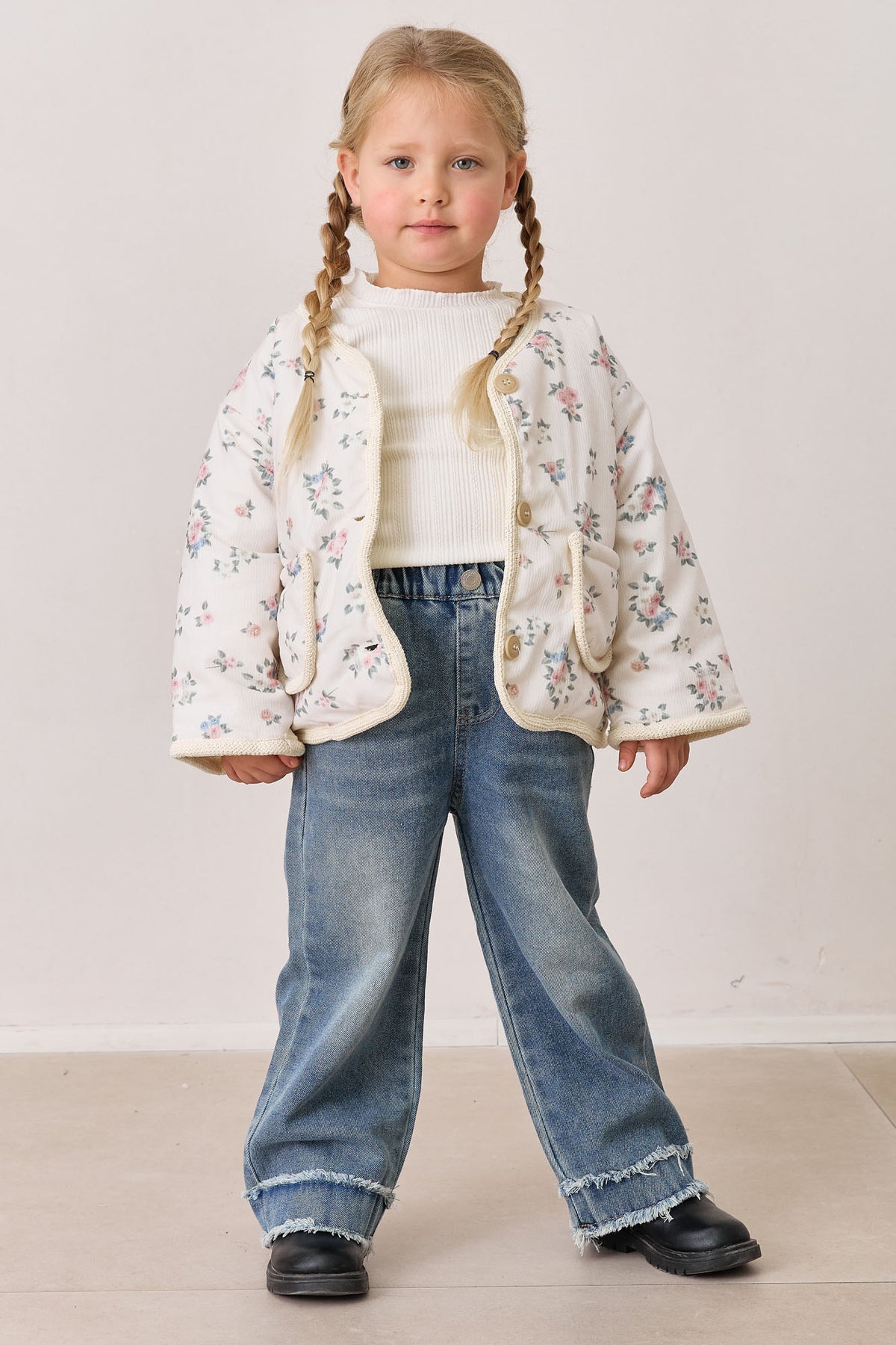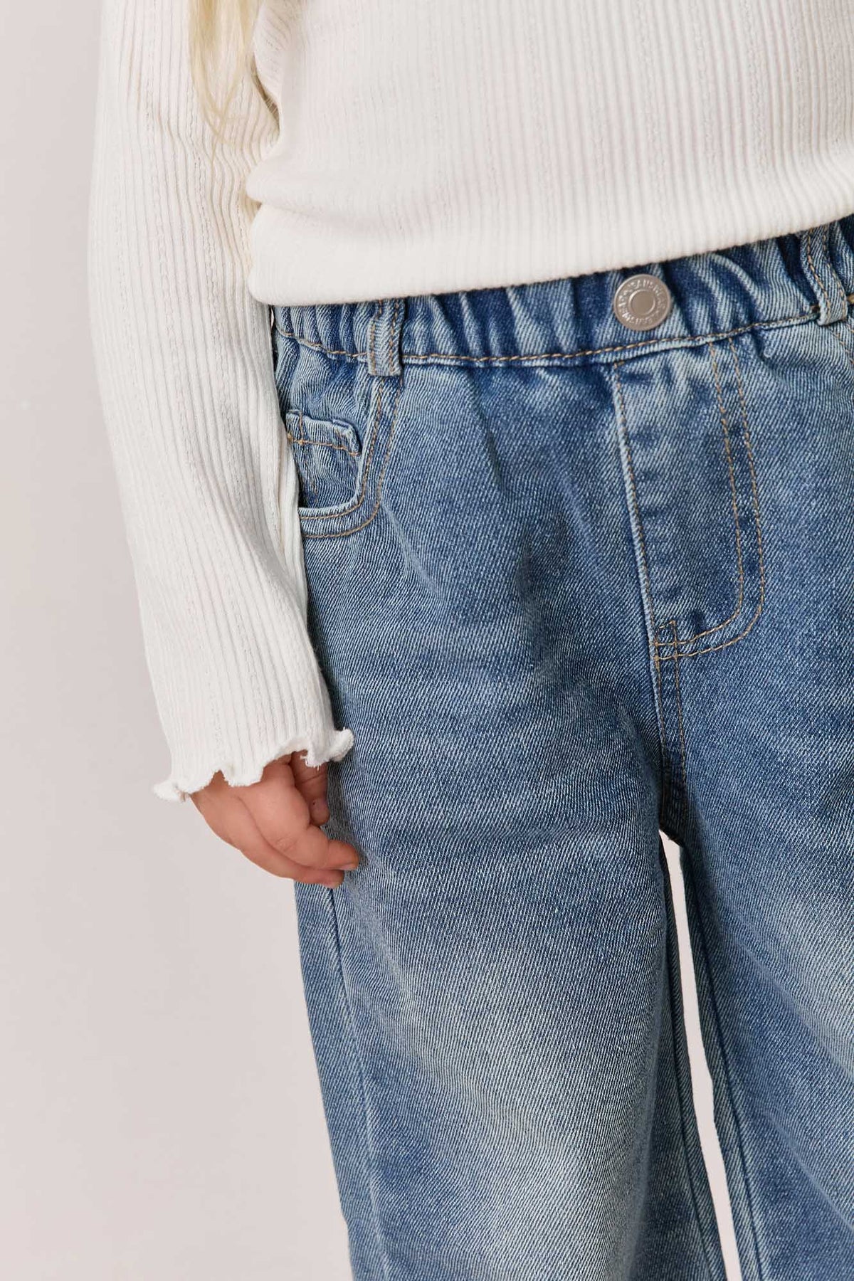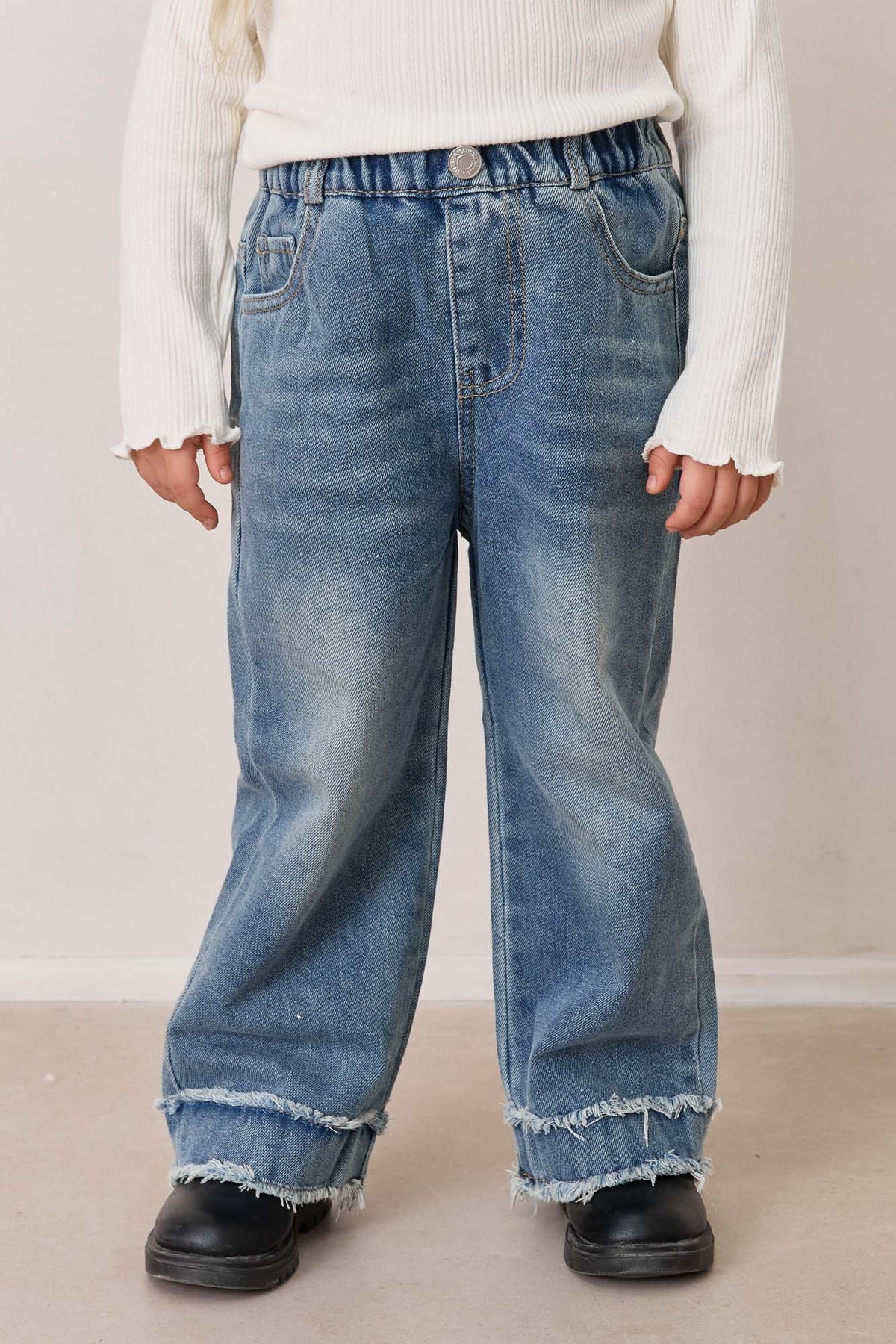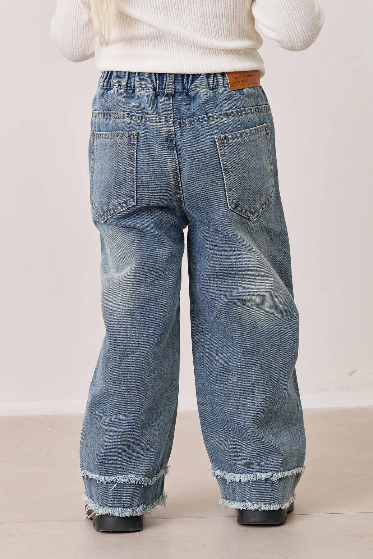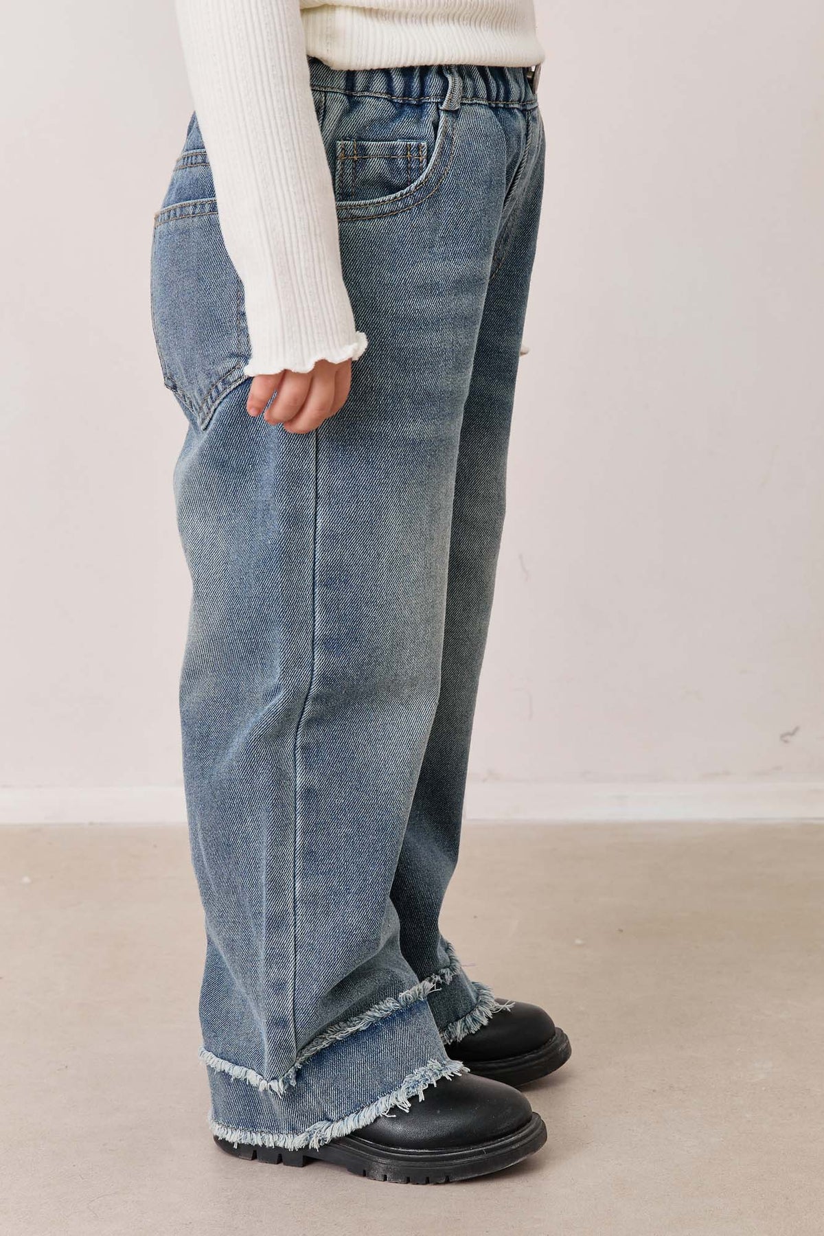 ג'ינס בגזרה ישרה עם גומי במותן, כיסים וסיומת מכפלת פרומה