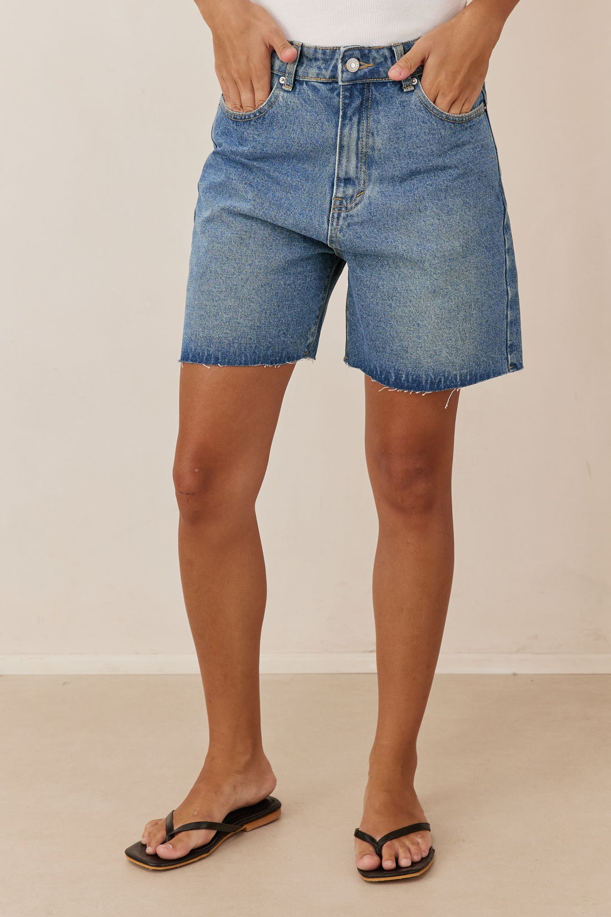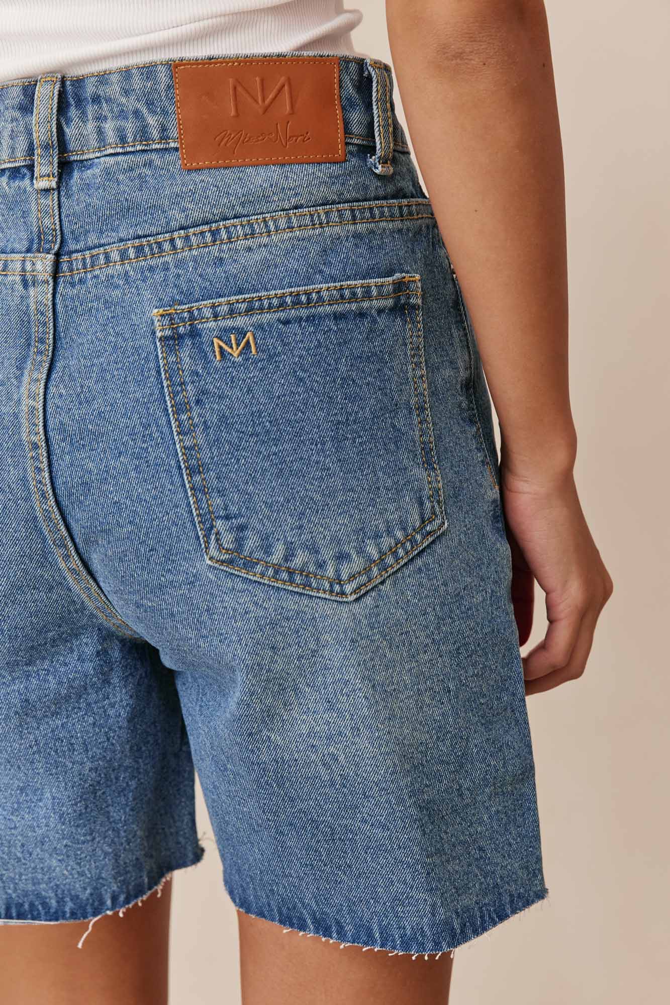 מכנסי ג'ינס קצרים בשילוב רקמת לוגו וסיומת פרומה