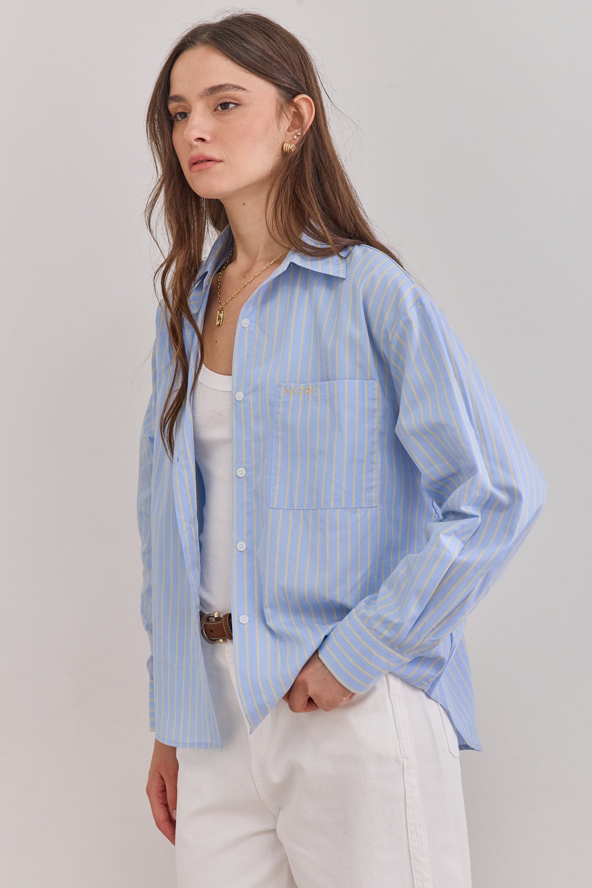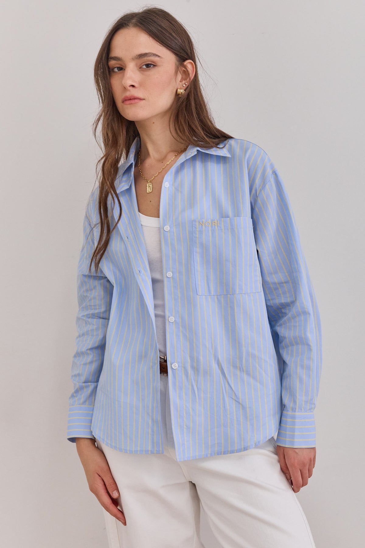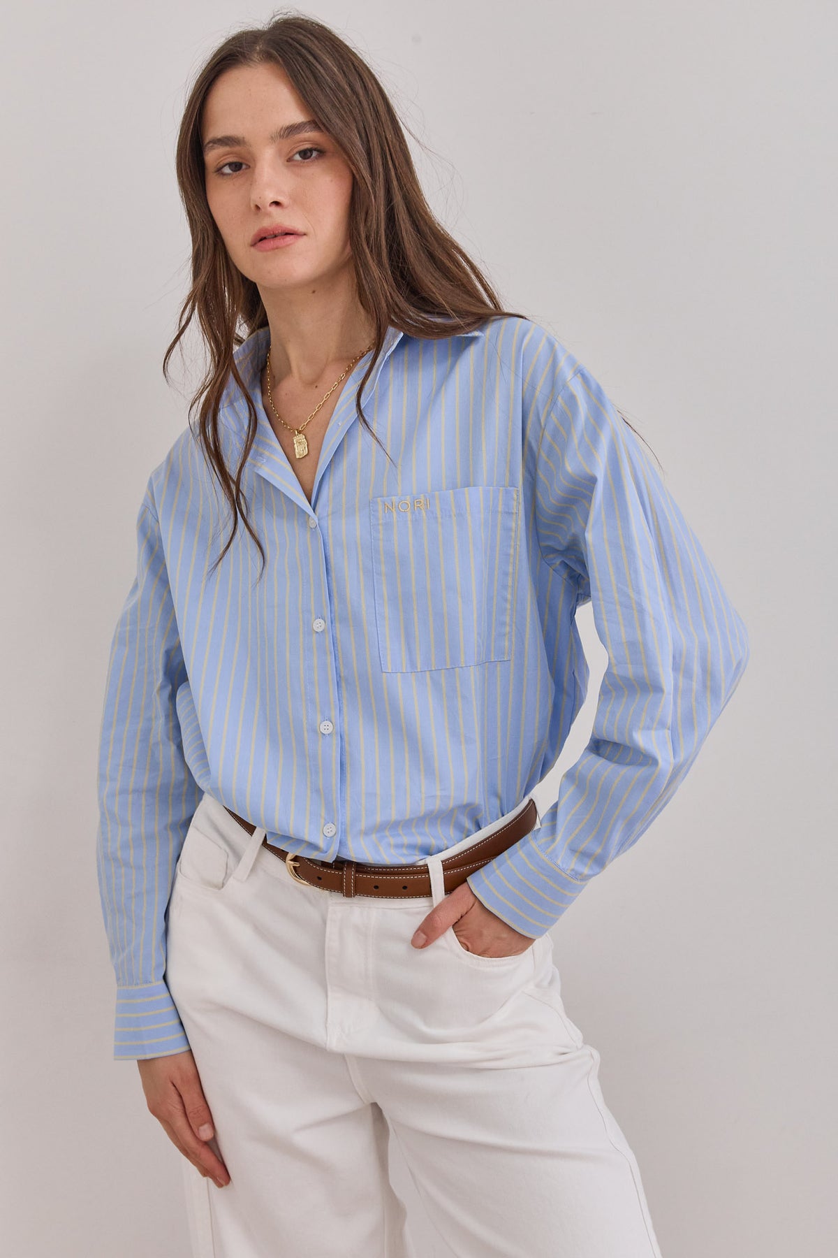 חולצה מכופתרת בגזרה רחבה בדוגמת פסים בשילוב כפתורים, כיס קדמי ולוגו נורי