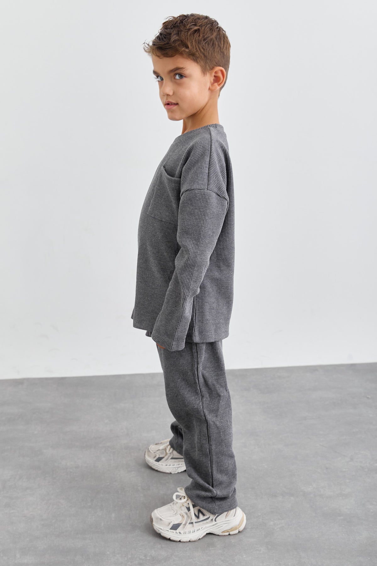 חליפת קים בד וופל בשילוב רקמת לוגו | אפור כהה