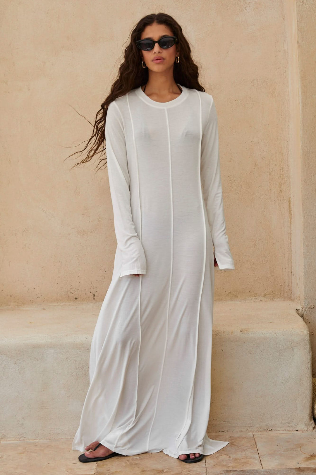 שמלת מקסי מאליבו בד שקפקף תיפורים בולטים | לבן