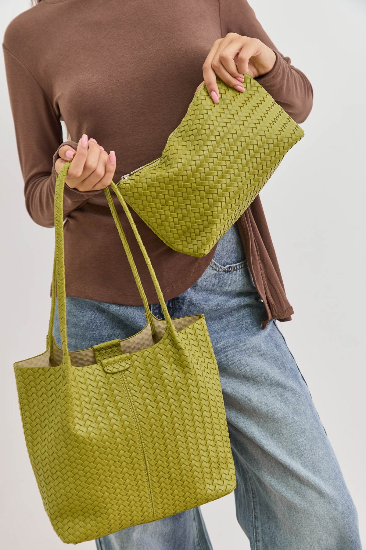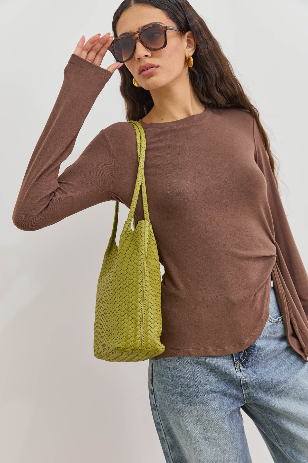 תיק כתף קלוע דמוי עור בשילוב רצועות דקות. לתיק תא אחסון יחיד וסגירת רוכסן מגיע יחד עם תיק מיני