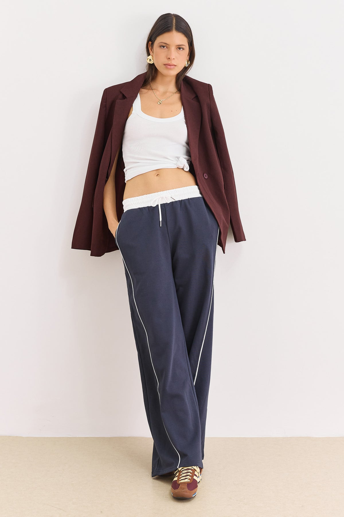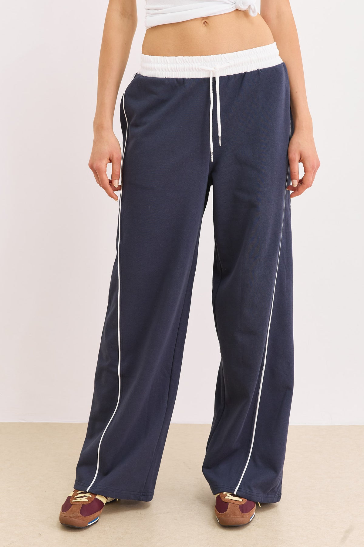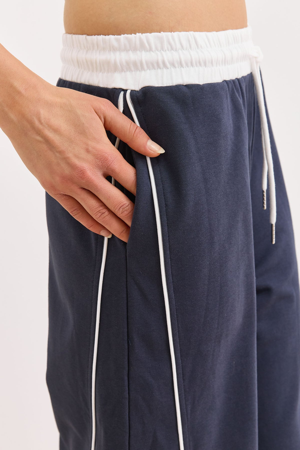מכנסיים ארוכים מתרחבים עם פסים צדדים בשילוב חגורה מובלטת גומי במותן ושרוך