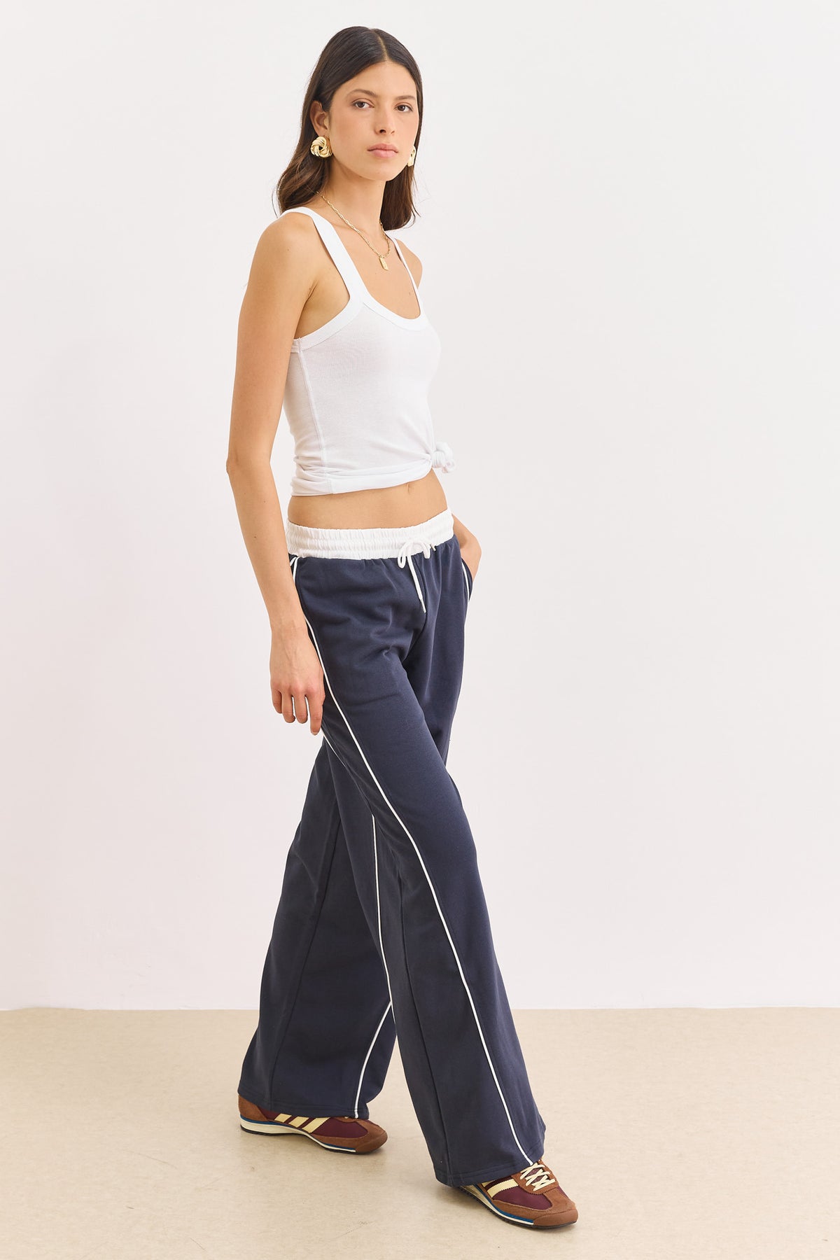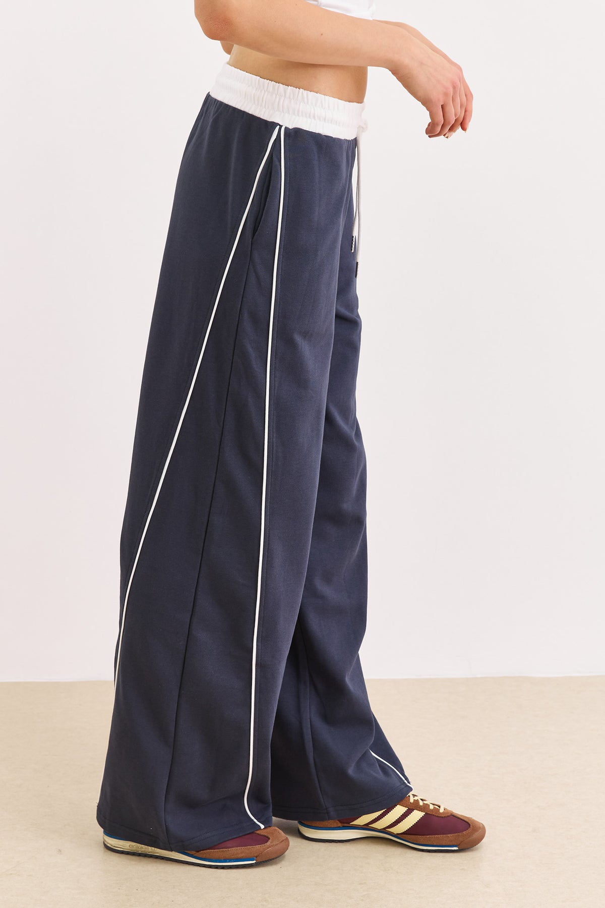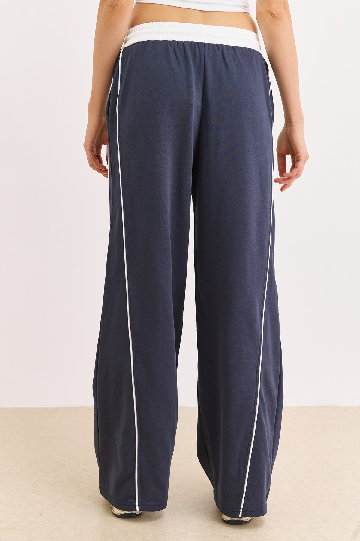 מכנסיים ארוכים מתרחבים עם פסים צדדים בשילוב חגורה מובלטת גומי במותן ושרוך