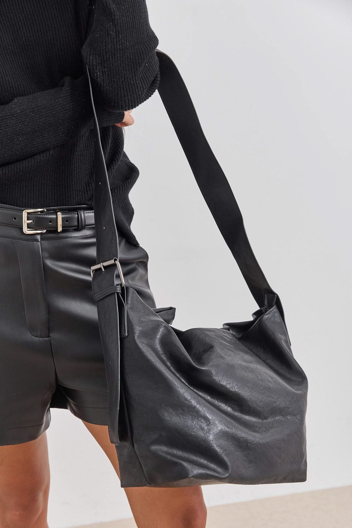 תיק שק דמוי עור בשילוב רצועה עבה מתכווננת ותא אחסון פנימי בסגירת רוכסן