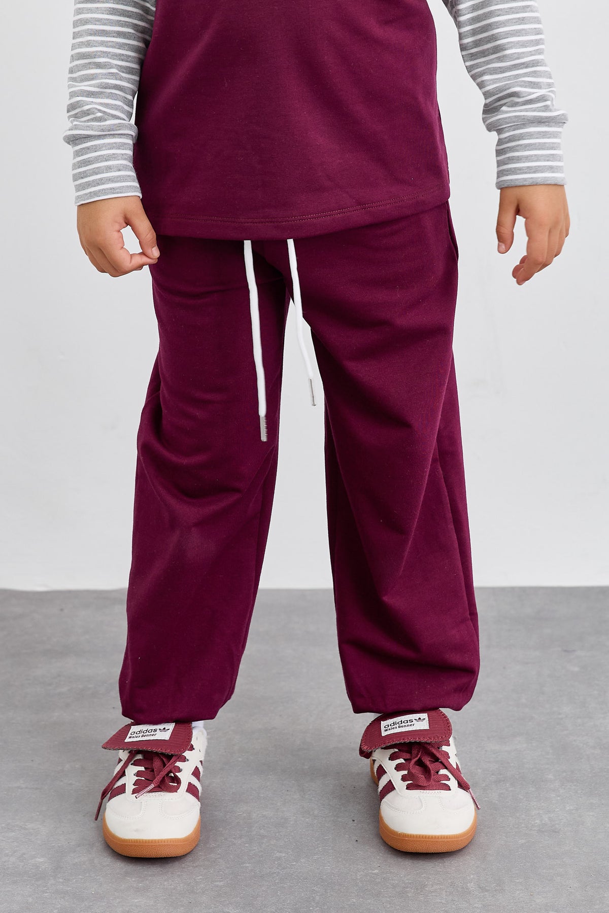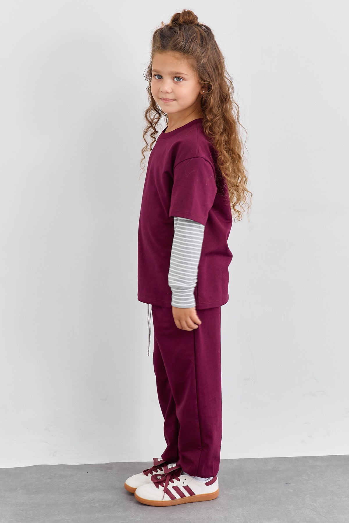 חליפת שני חלקים יוניסקס טי שירט אוברסייז עם שילוב שרוולים מבד כותנה פסים ומכנס בלון עם גומי במותן ושרוך