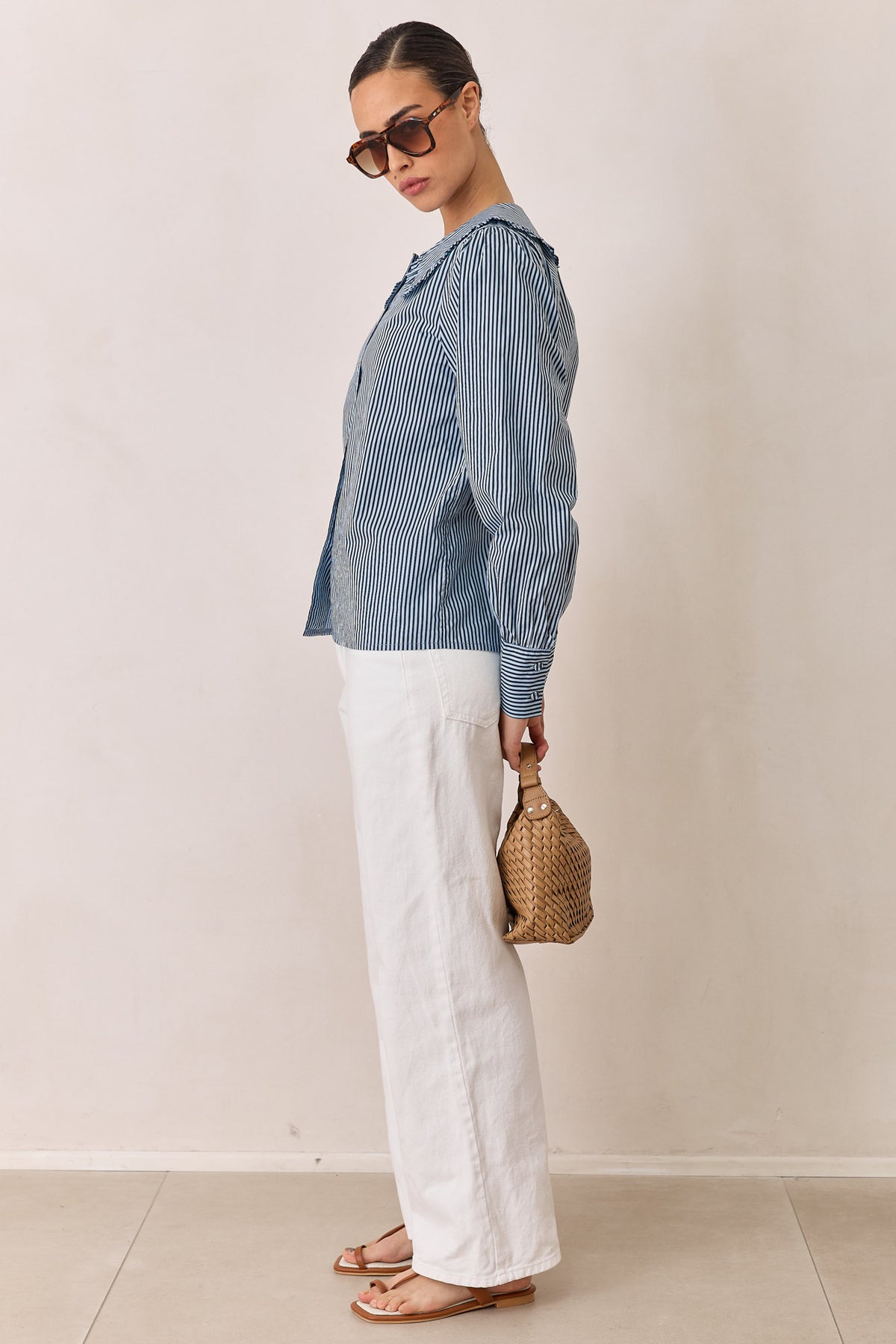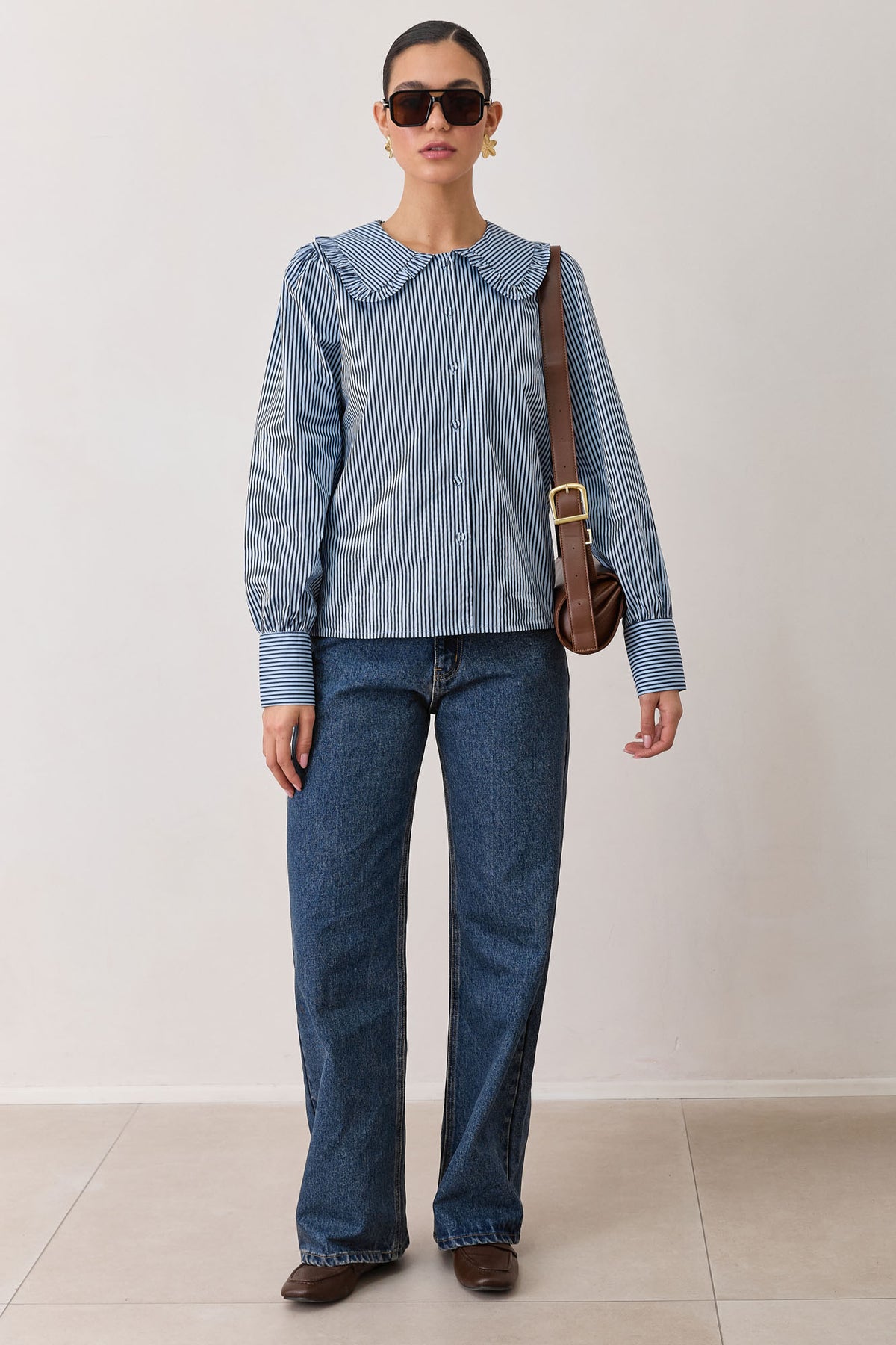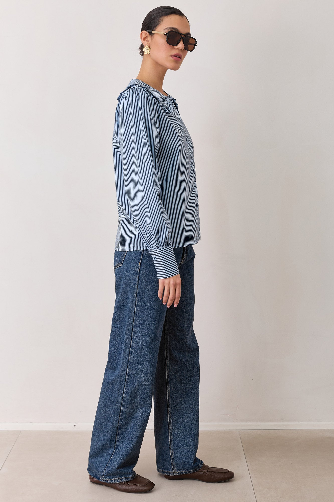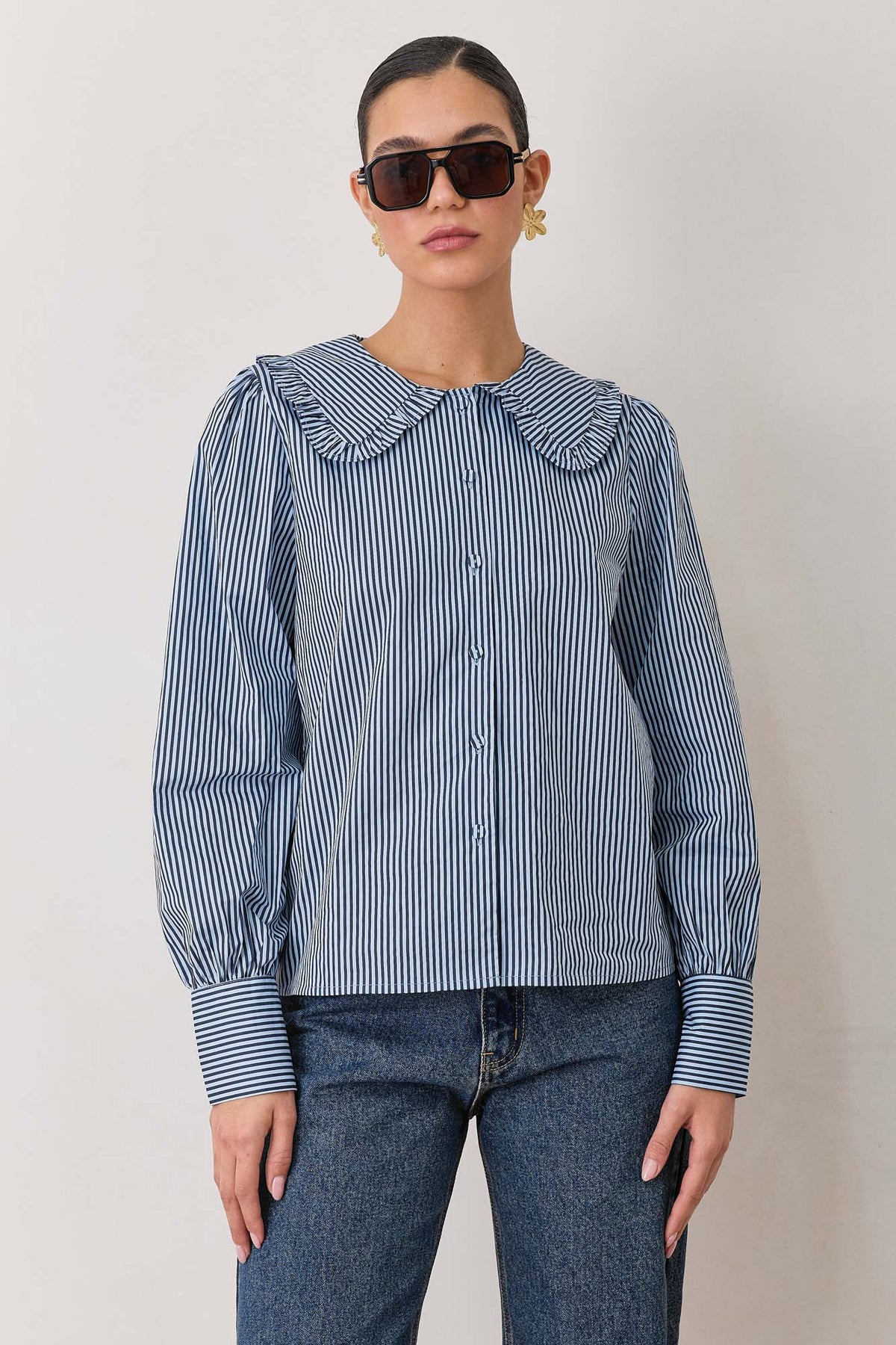חולצה מכופתרת עם הדפס פסים עם צווארון בסיומת וולנים