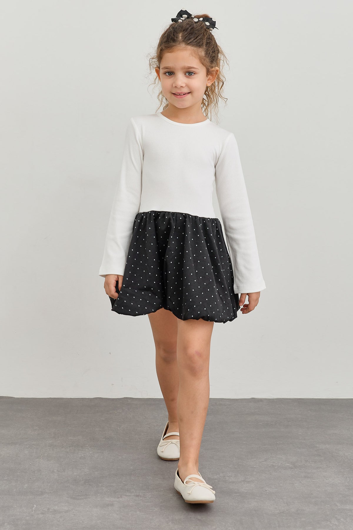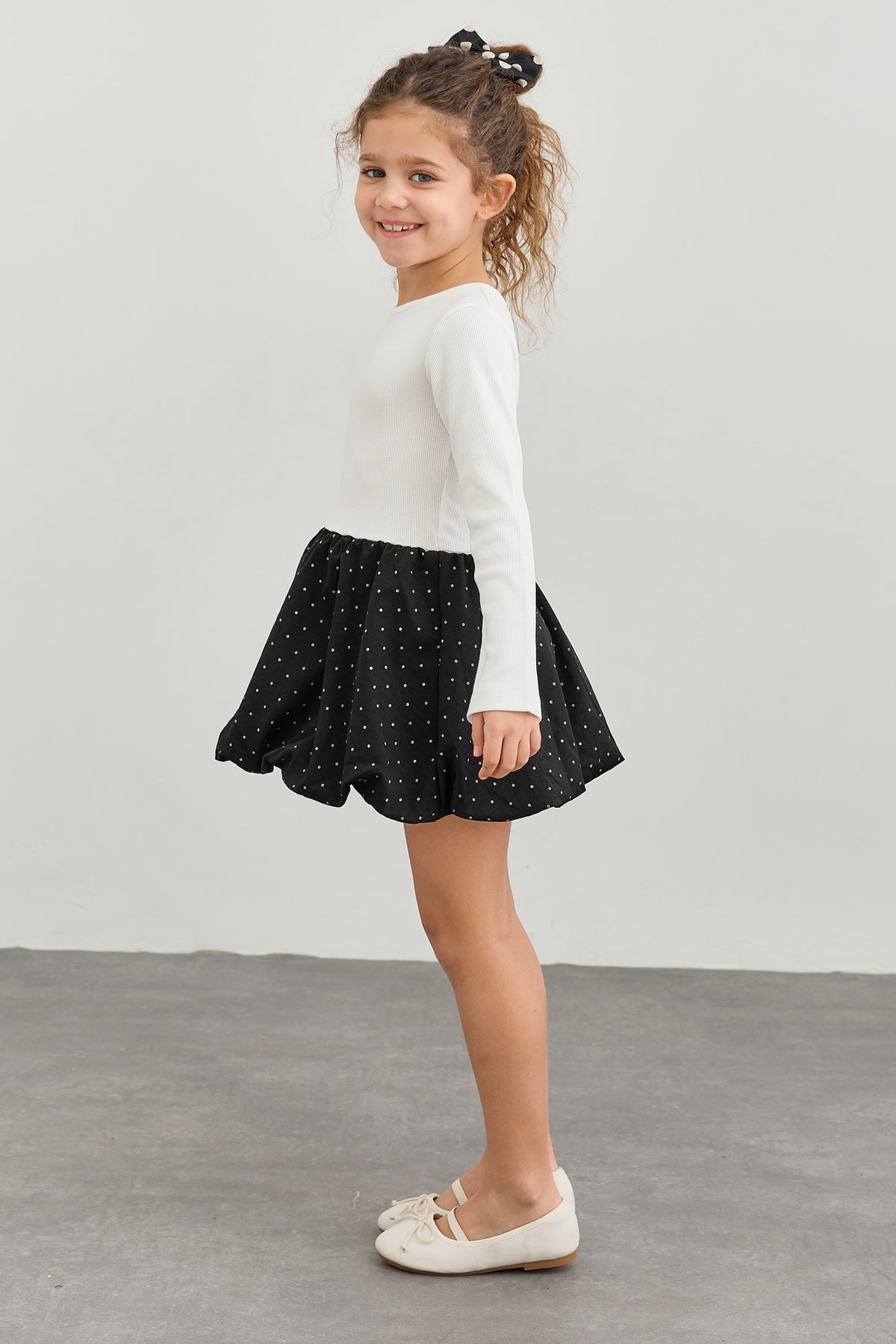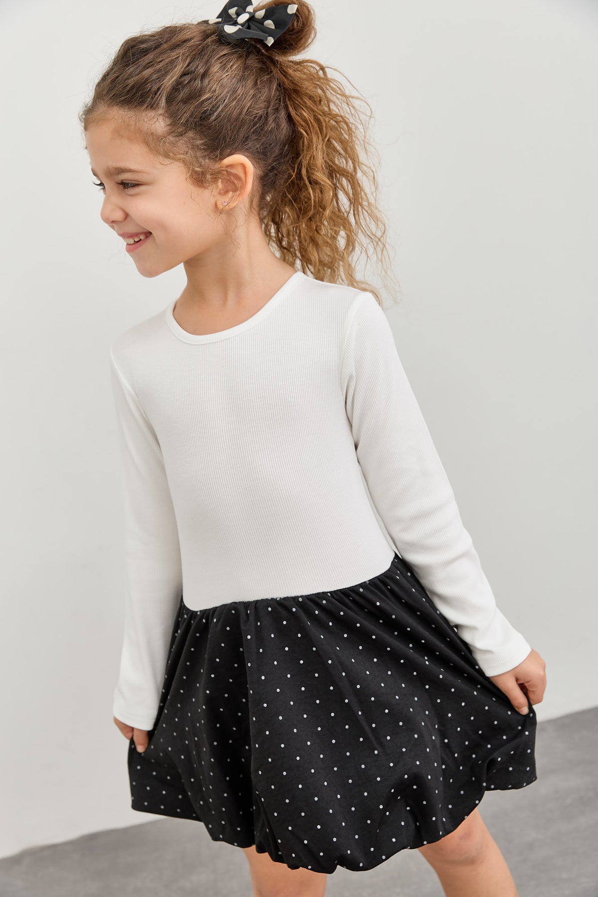 שמלת בלון חלק עליון מבד ריב בגזרה צמודה יחסית, חצאית בלון מבד ניילון בהדפס נקודות